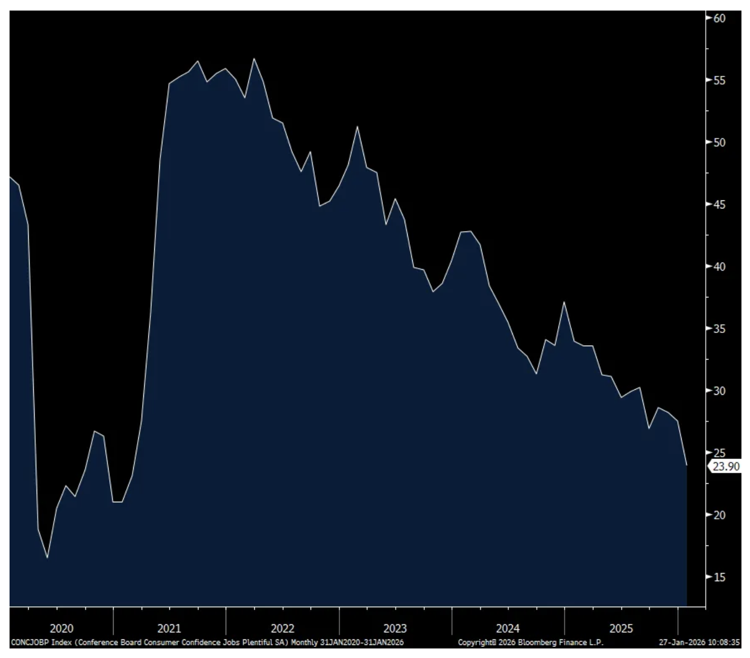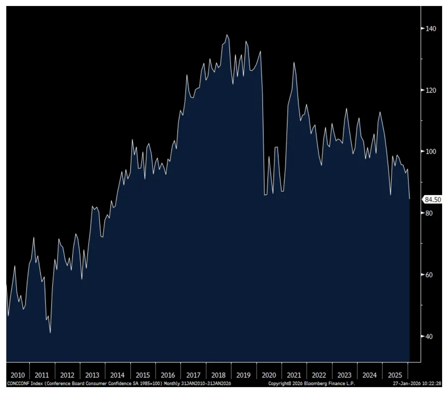 The January consumer confidence index from the Conference Board fell to 84.5, the softest since May 2014, from 94.2 and well below the estimate of 91. The Present Situation fell about 10 pts as did Expectations. One year inflation expectations ticked up to 5.7% from 5.4% and vs 5.8% in the month before that.