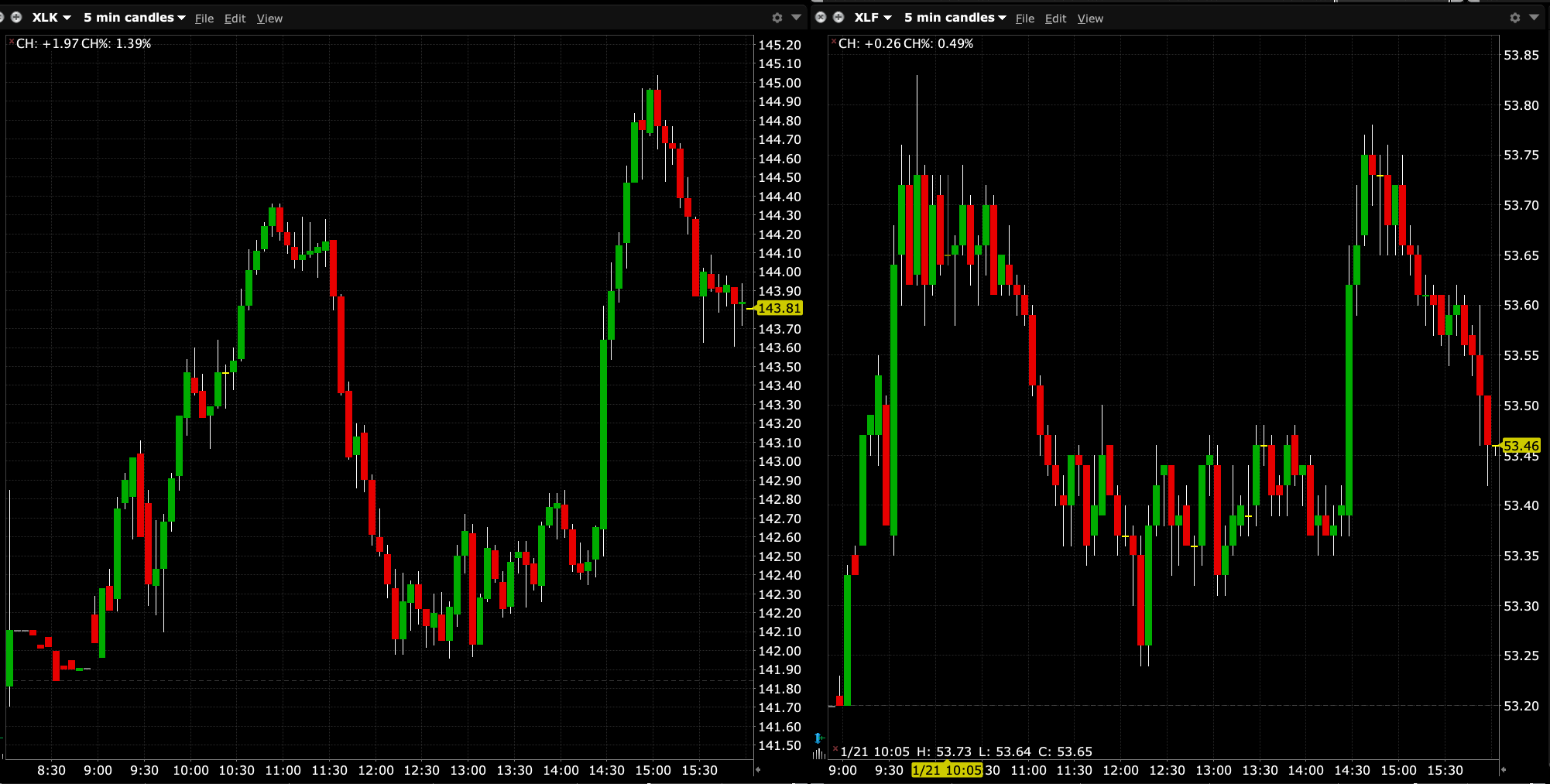 Look at the intraday charts of the Tech ETF (XLK) and compare it to the Financials ETF (XLF) below.
