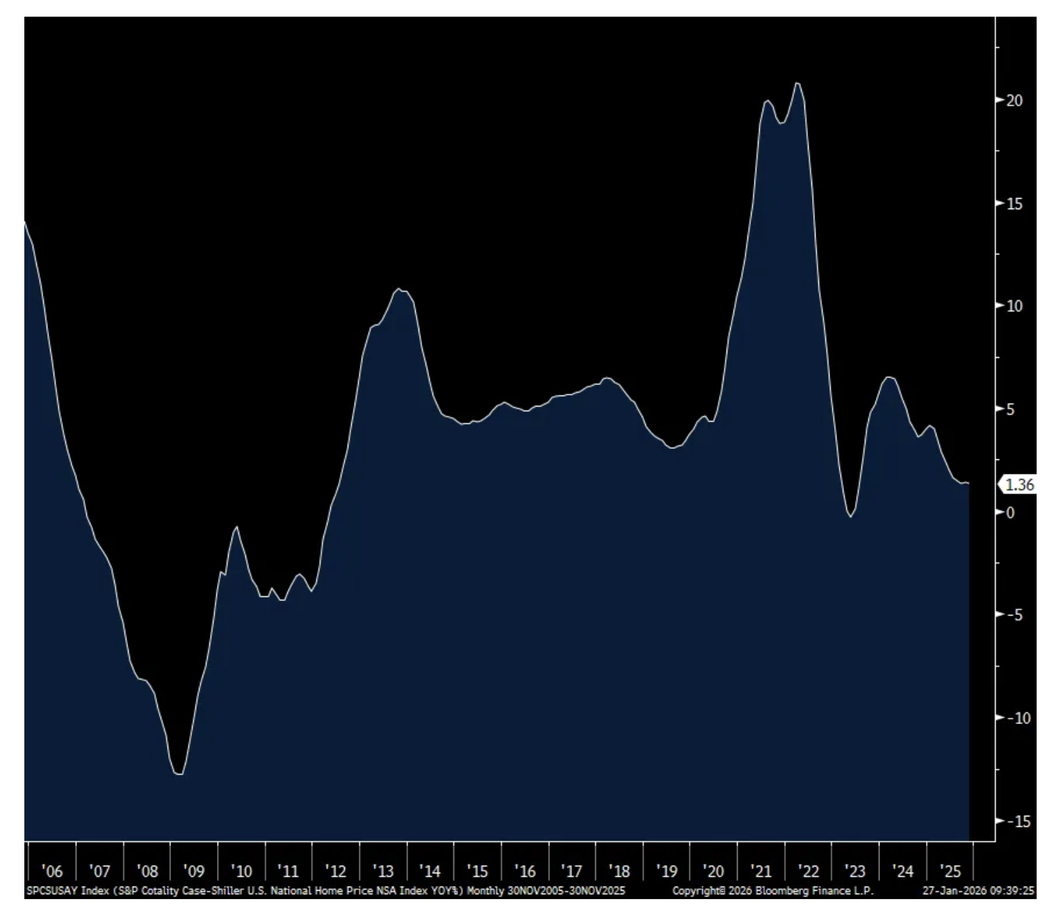 The November national home price index from S&P Cotality rose 1.4% y/o/y, about as expected and a similar pace seen in October. It is though the slowest pace of gain since July 2023 and I think that is a good thing. For all the debate and announced initiatives to spur the number of transactions in the housing market anything that just gooses the demand side without a coincident increase in supply will just further raise home prices that would offset the benefit of lower mortgage rates/fees/whatever. I’d say 25 years of doing so in such an extreme way is enough evidence. Homeowners have enjoyed a tremendous increase in equity in their homes and maybe they can tap that for a new kitchen and/or daily expenses and they won’t like a drop in the value of their home but we need more first time home buyers along with supply in order to increase the number of transactions to unfreeze the market.