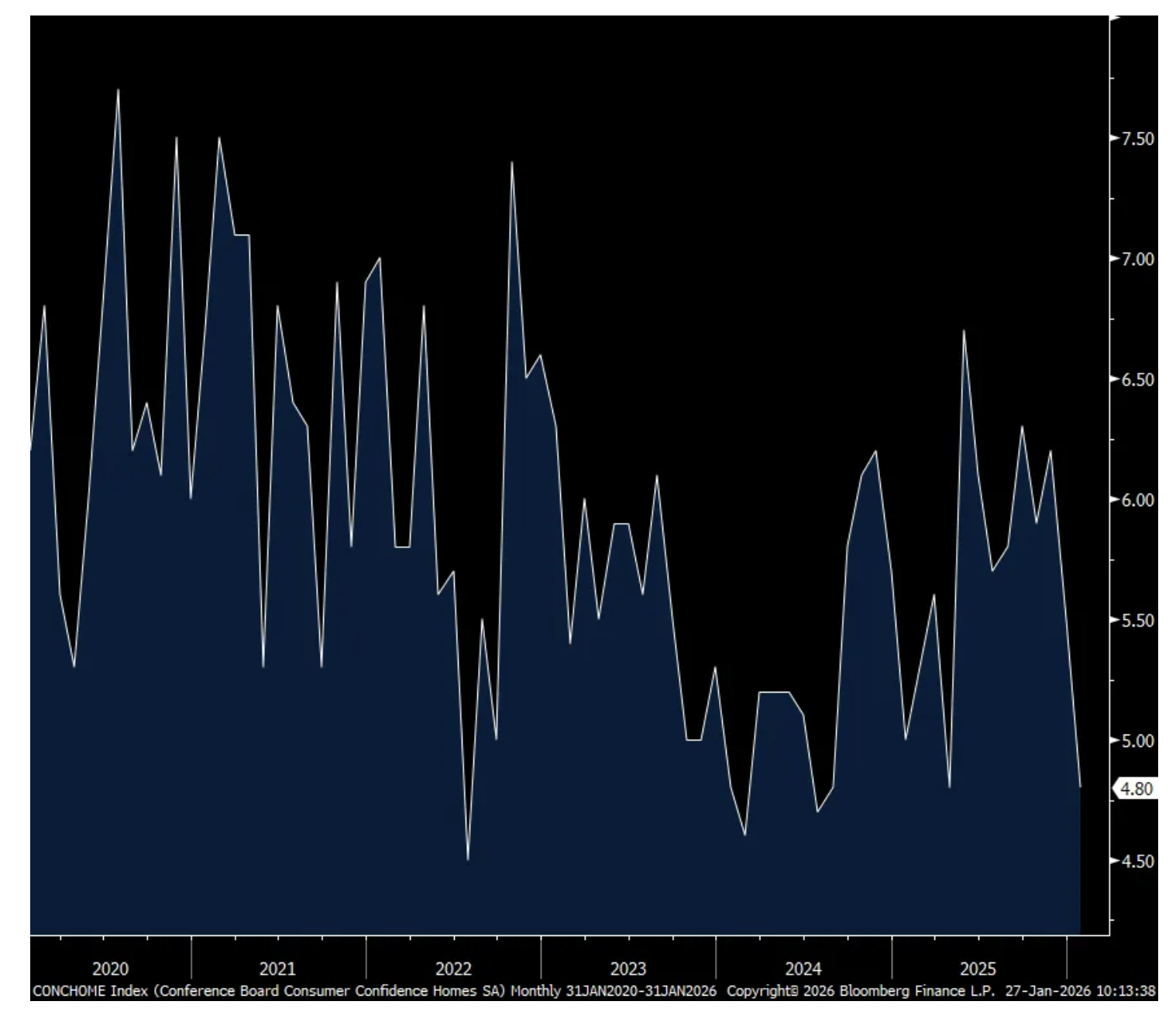 Spending intentions to buy a home fell to match the lowest since July 2024, notwithstanding the recent dip in mortgage rates. They fell too for vehicles and major appliances.