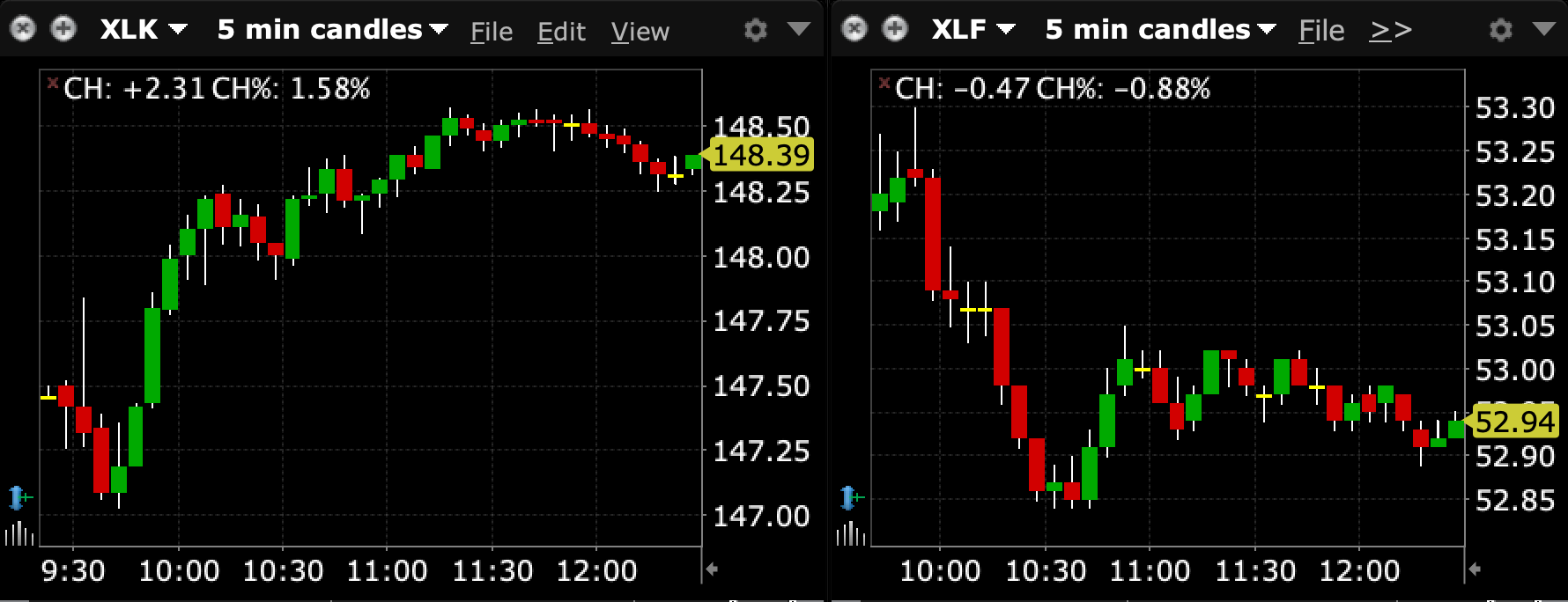 In reference to the prior column, here is a side-by-side intraday comparison of (XLK) (Tech) vs. (XLF) (Financials) as of 12:25 pm: