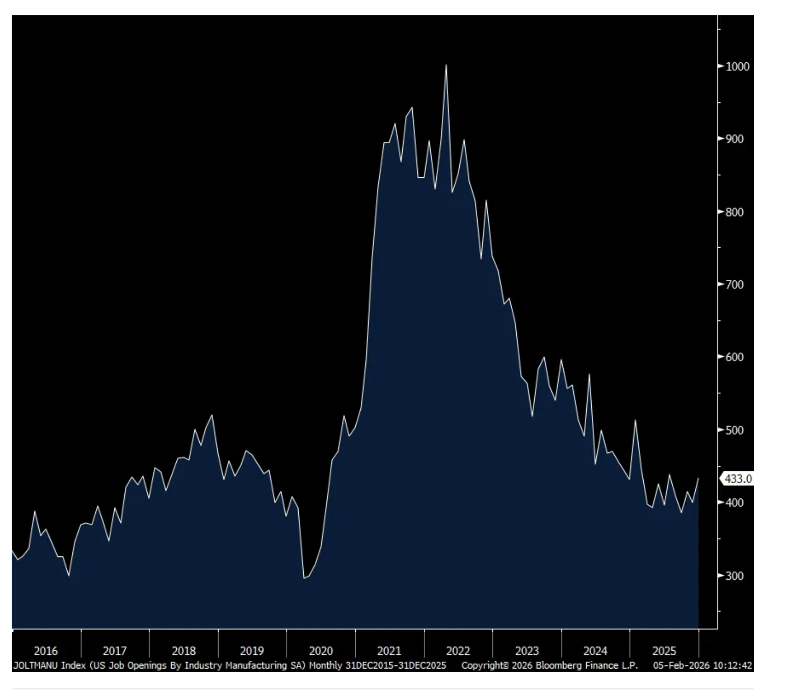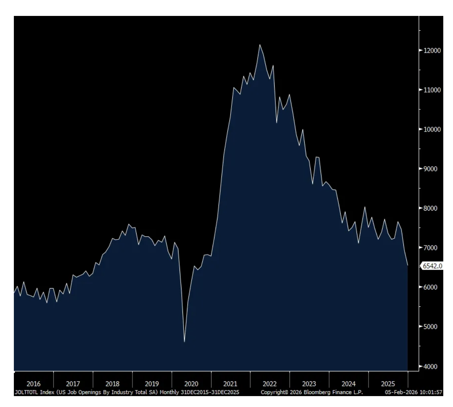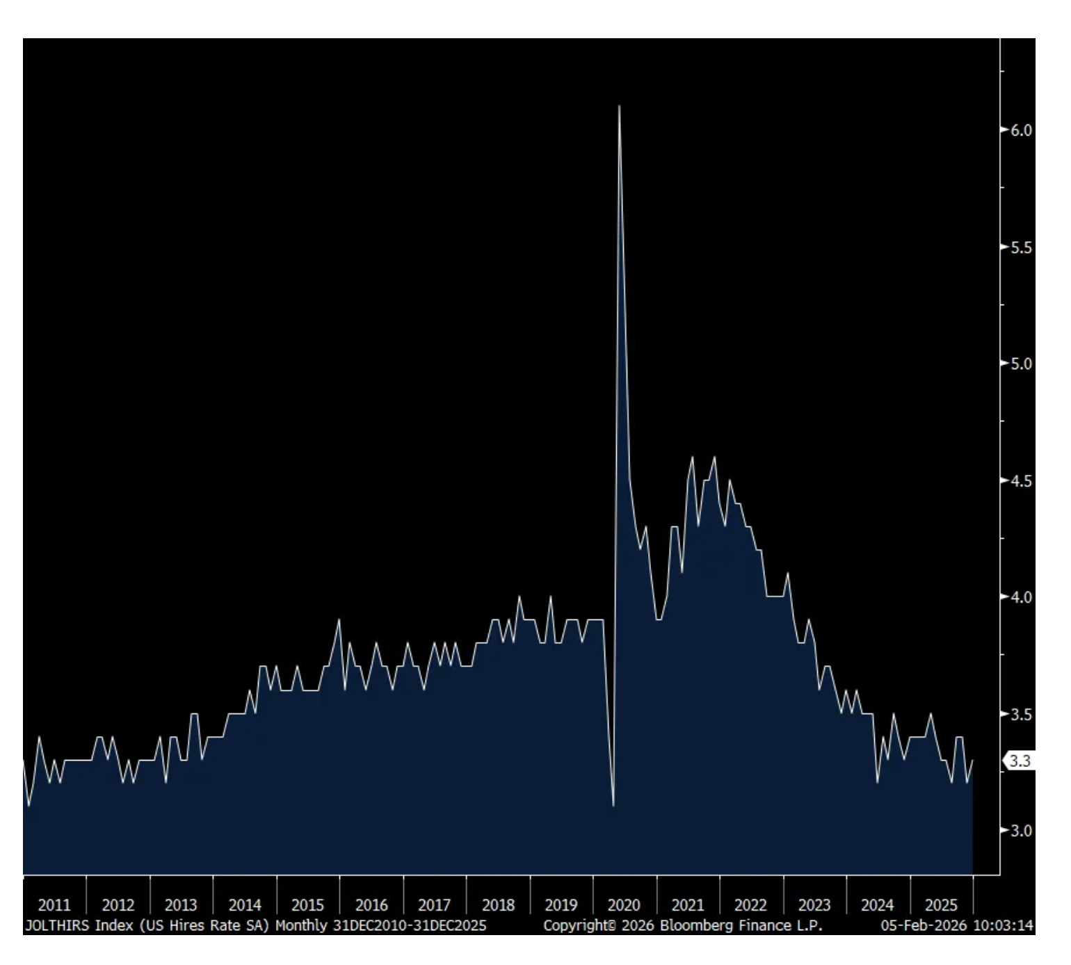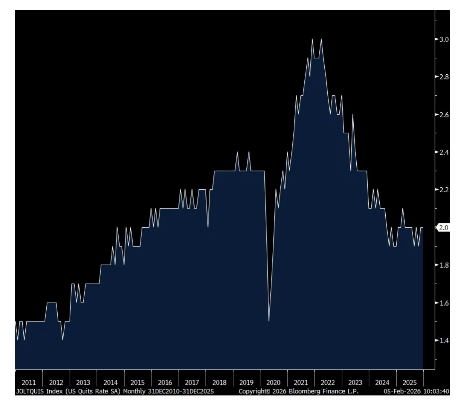 The number of job openings in December fell sharply m/o/m to 6.54mm from 7.15mm in November. That is the least since November 2020 and if we take out Covid, it’s the lowest amount since February 2018. The hiring rate did tick up by one tenth to 3.3% but off a level that matched the lowest since 2011 not including Covid. The quit rate held at 2%.