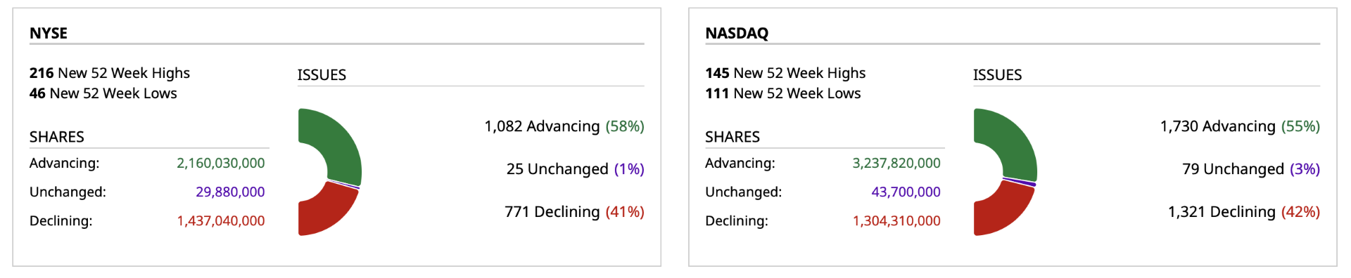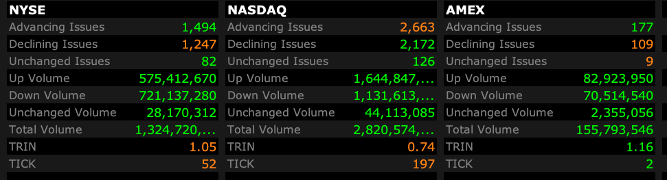 - Nasdaq volume 10% below its one-month average;
