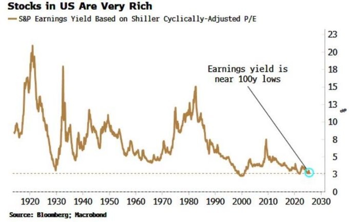 As part of the ERP, the earnings yield (inverse of the P/E ratio) is near a century-year-old low. The only time it was lower was during the dot-com bubble: