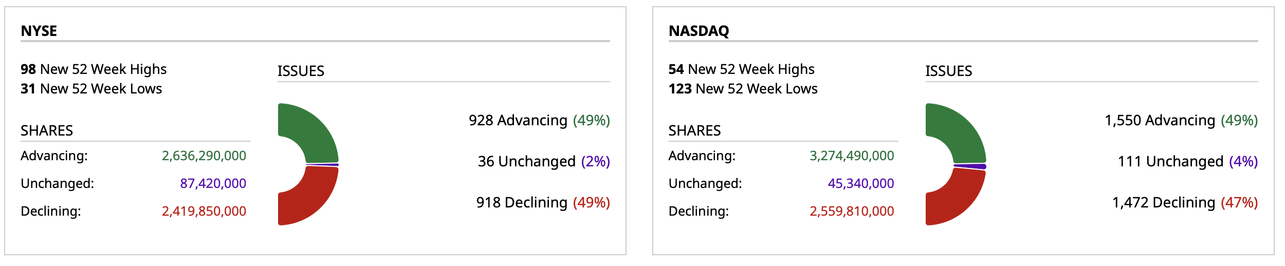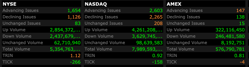 - NYSE volume 2% below its one-month average;
