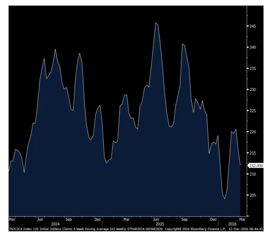 Initial claims for the week ended 3/7 were little changed at 213k vs 214k last week and about as expected. The 4 week average slipped to 212k from 216k as a print of 229k drops out. Continuing claims fell to 1.85mm from 1.871mm as expected.
