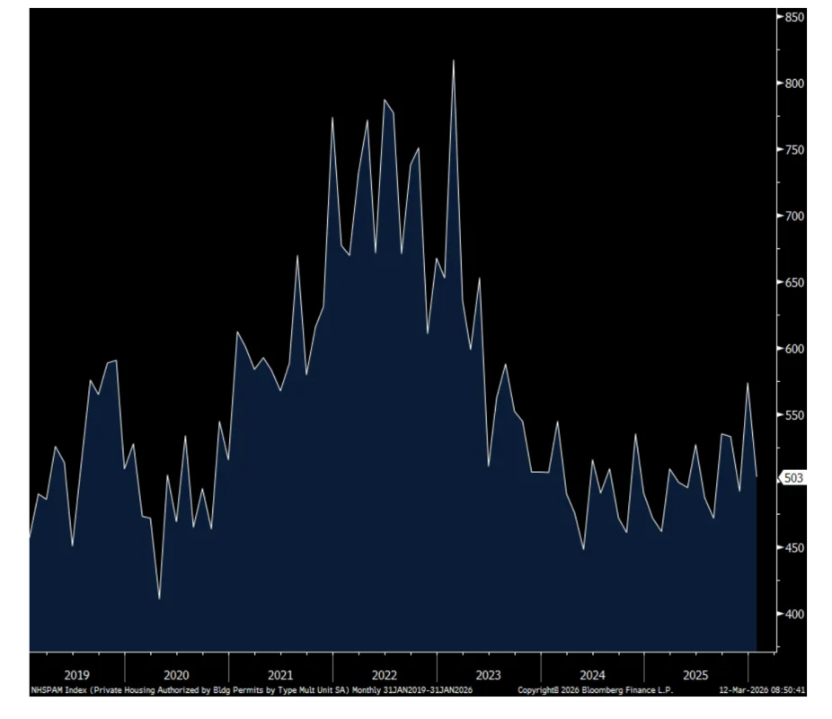 Housing starts in January (older news) jumped more than expected to 1.487mm vs the estimate of 1.341mm but the internals were quite mixed. Single family starts fell by 27k m/o/m but after rising by 31k in December. Multi family starts were where the upside was, going to 552k from 425k in this very volatile category.