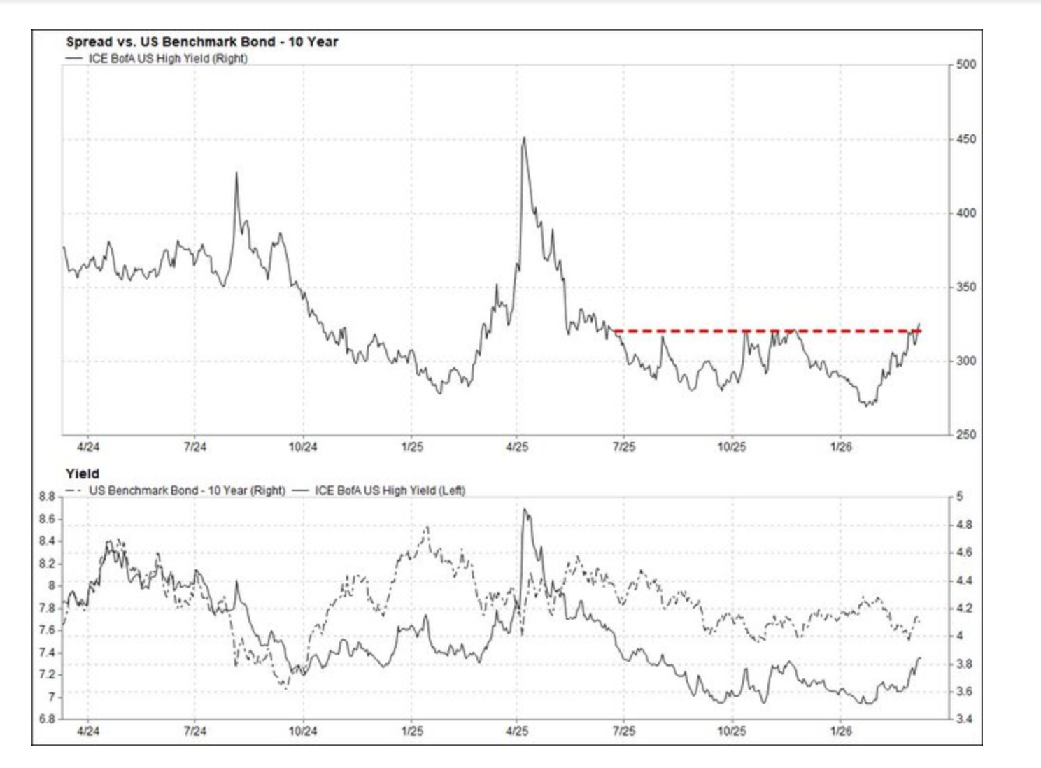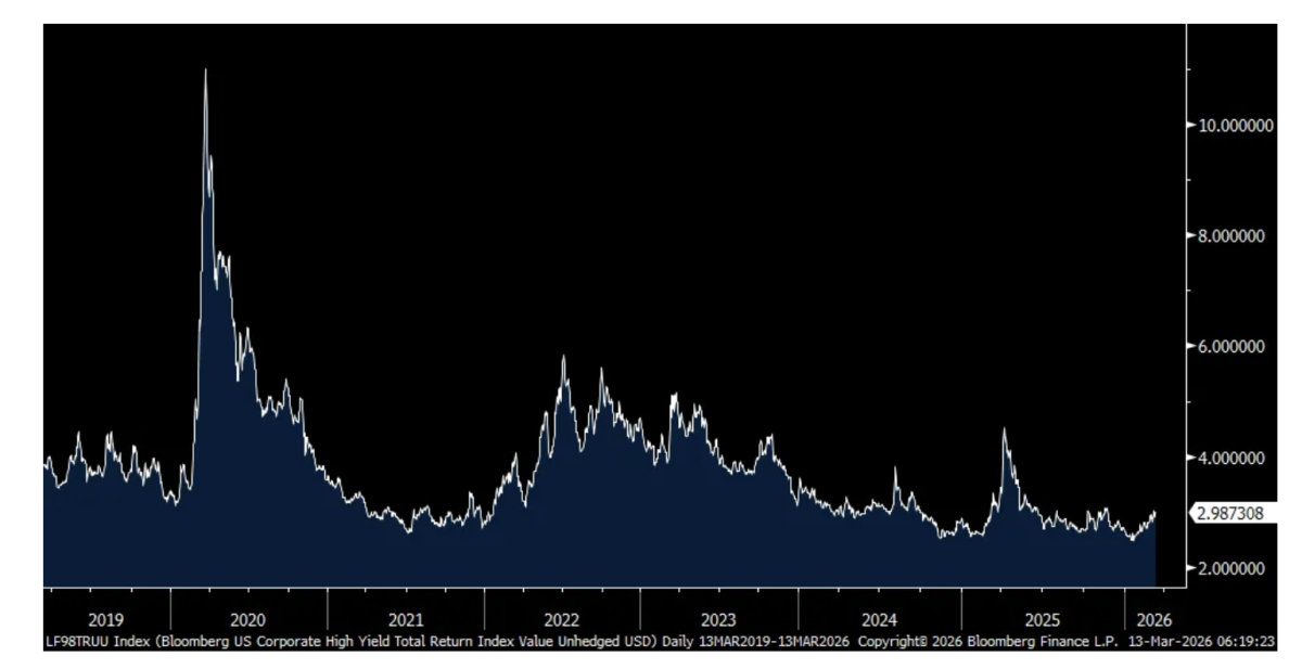 With the heightened focus on what is going on in private credit, I keep watching to see if there is any spillover into high yield. While there has been a lift off the lows in spreads, it still remains near the multi year bottom at just under 300 bps.