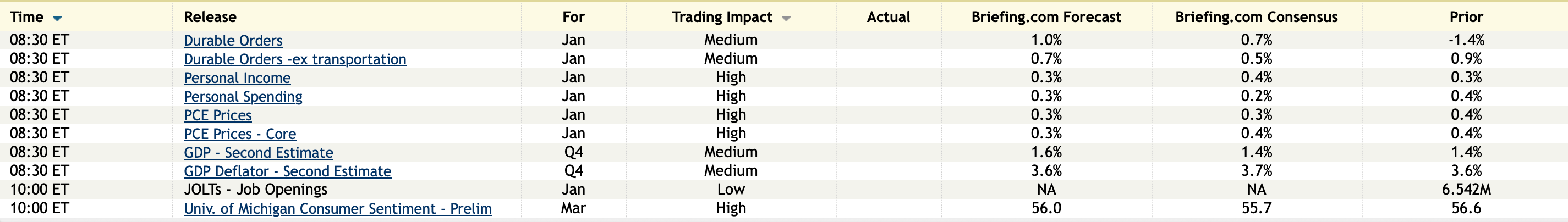 Keep in mind that today’s PCE inflation stats along with income, spending and also the release of durable goods are all January data. With inflation specifically, we saw the CPI for February last week so this is all old news, especially with what has happened over the last few weeks.