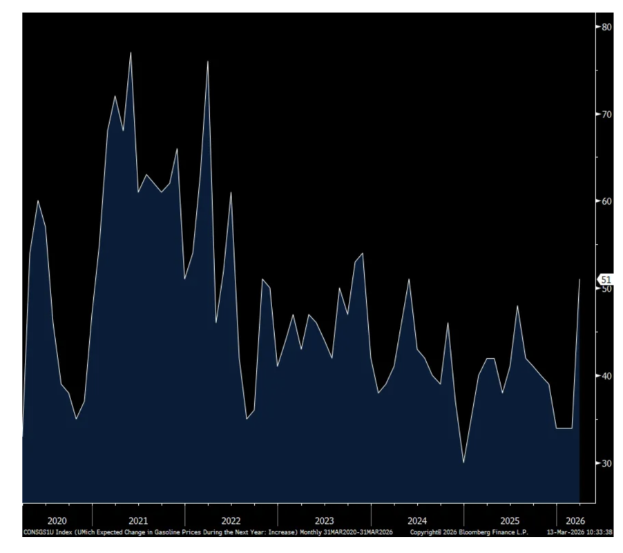 As part of the survey was taken place before the war and the balance after, this is what UoM said, “Interviews completed prior to the military action in Iran showed an improvement in sentiment from last month, but lower readings seen during the nine days thereafter completely erased those initial gains. Gasoline prices have exerted the most immediate impact felt by consumers, though the magnitude of passthrough to other prices remains highly uncertain.”