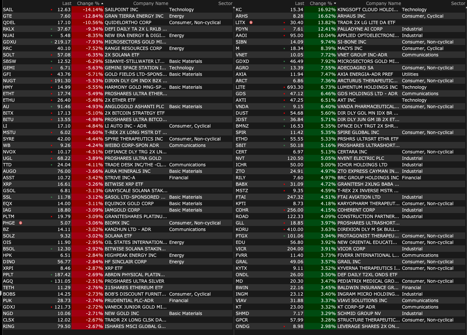 -SAIL -14% (earnings, guidance) -IAUX -11% (files to sell $200M convertible senior note offering) -TTD -4.9% (Rosenblatt Securities Inc. Cuts TTD to Neutral from Buy, price target: $25) -DUOL -2.7% (Argus Cuts DUOL to Hold from Buy) -LULU -2.1% (earnings, guidance) -GIS -2.0% (earnings, guidance)