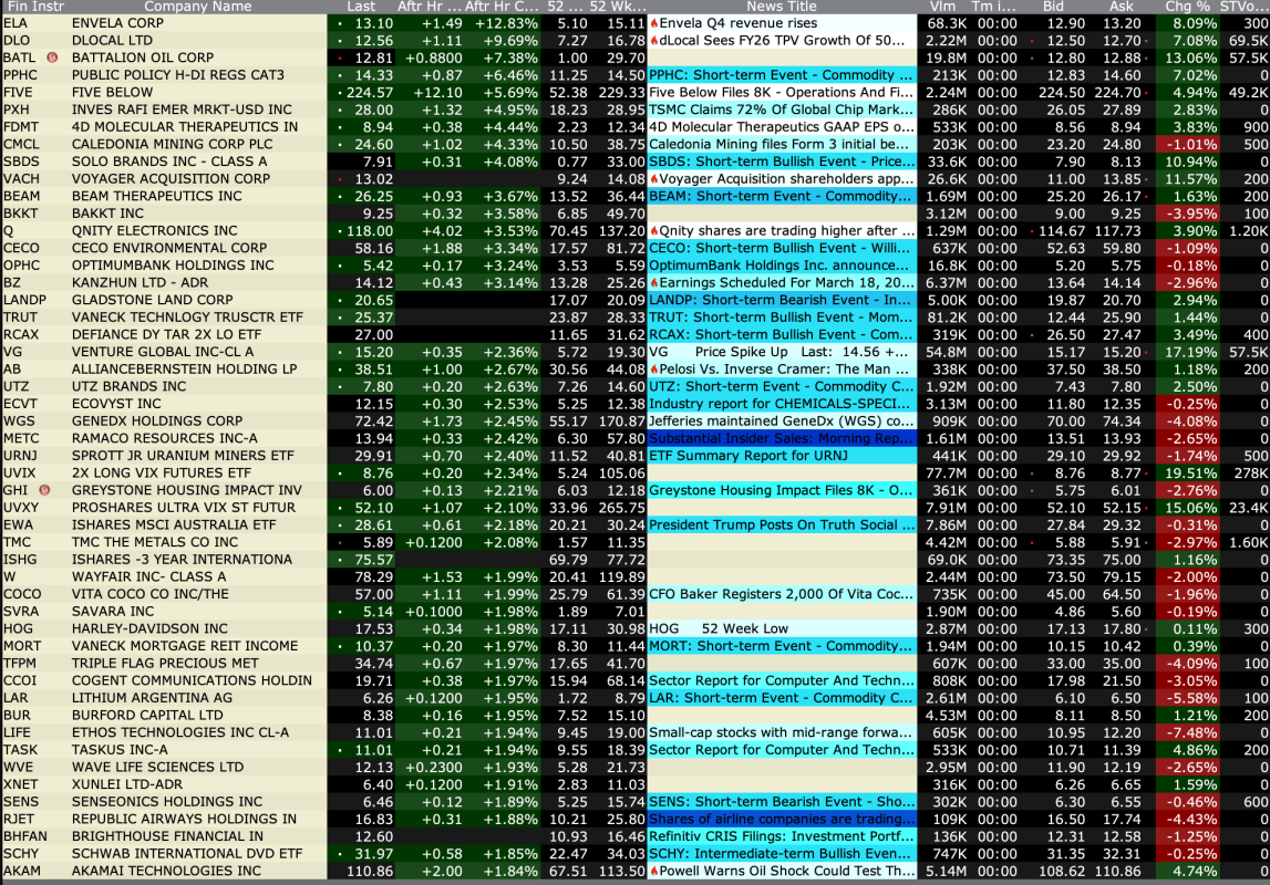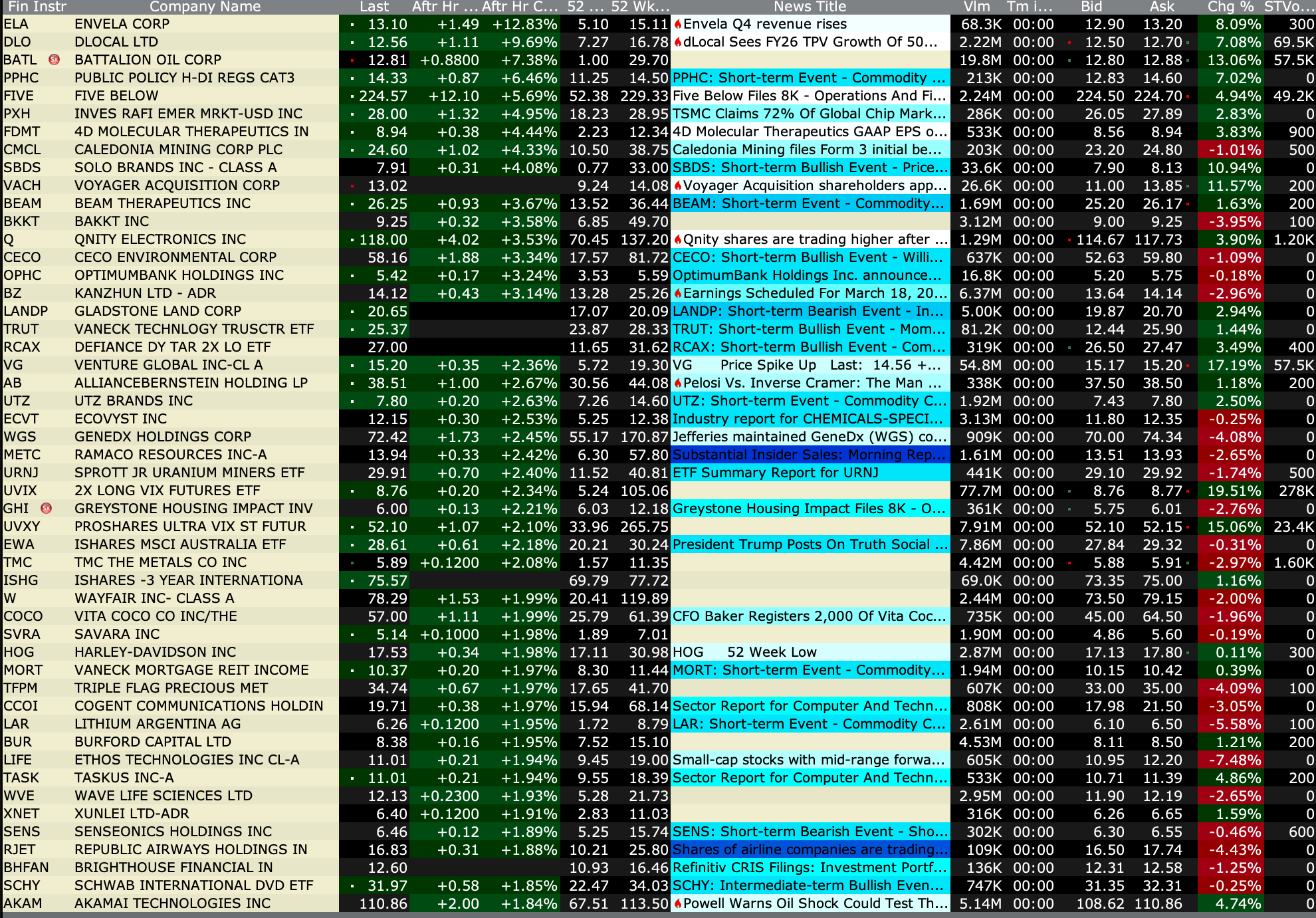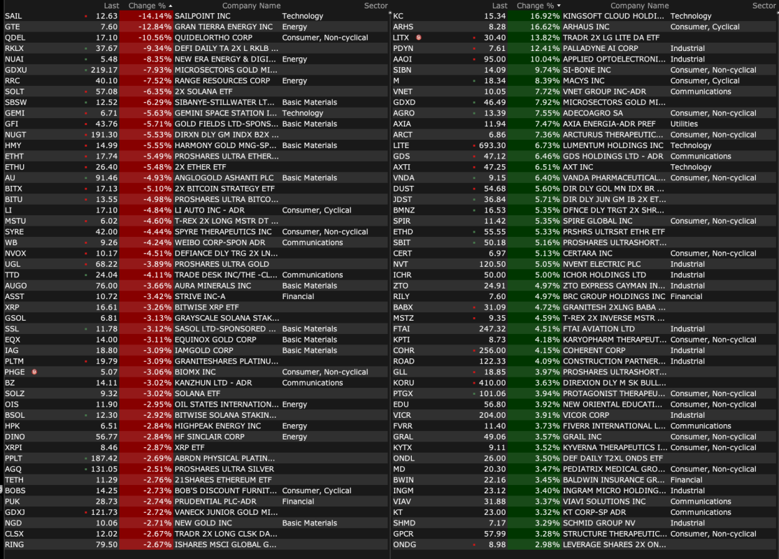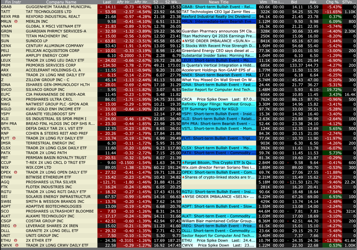 -ARTL +36% (announces Third-Party Fully Funded Clinical Study Agreement to Evaluate ART27.13 in Glaucoma Patients) -SWMR +24% (momentum following IPO) -PERF +23% (receives going-private proposal at $1.95/shr) -OVID +19% (OV329 (7 mg dose) demonstrated favorable safety and tolerability profile, reinforcing best-in-category potential for refractory epilepsies, supporting Indication Expansion; reports earnings and prices 29.9M common share offering at $2.01/unit in Private Placement) -HIT +18% (Health In Tech and Amazon Web Service Advanced Tier Service Partner Ciklum Announce Strategic Collaboration to Accelerate Development of AI-Driven InsurTech Platform) -PDYN +13% (subsidiary selected by U.S Navy to develop low cost near hypersonic missile) -M +7.8% (earnings, guidance) -PTGX +3.9% (receives U.S. FDA approval of ICOTYDE (icotrokinra) for the treatment of moderate to severe plaque psoriasis) -SPIR +2.9% (earnings, guidance) -SLG +2.5% (Deutsche Bank Raised SLG to Buy from Hold, price target: $44) -KNX +2.3% (UBS Raised KNX to Buy from Neutral, price target: $66 from $54) -GRAL +2.1% (TD Cowen Raised GRAL to Buy from Hold, price target: $65 from $114)