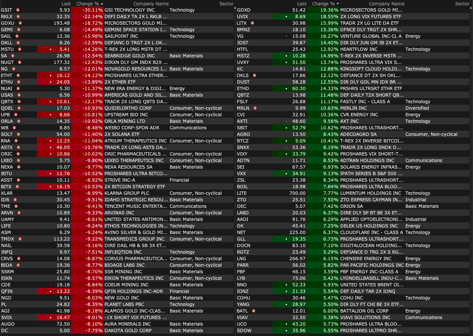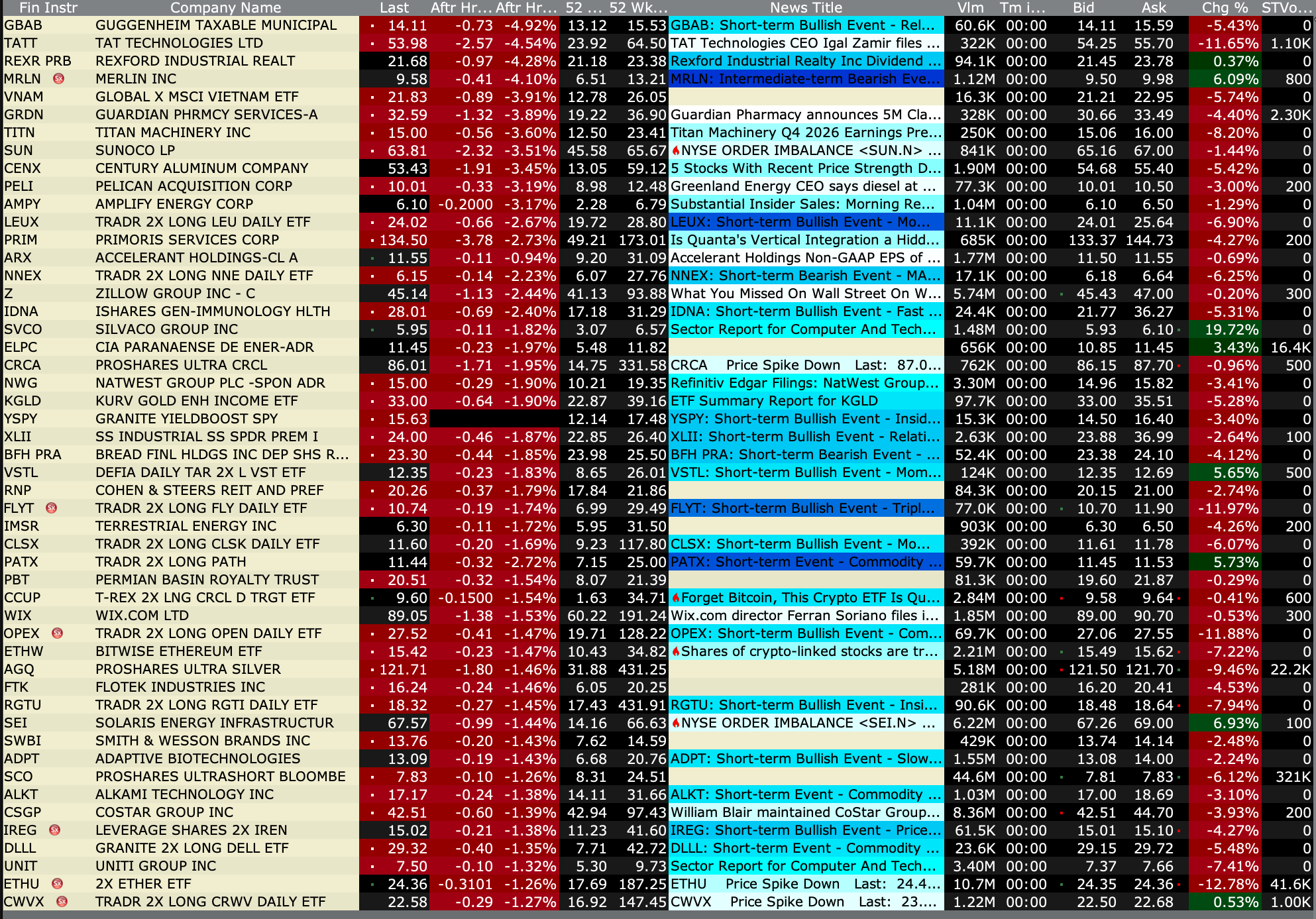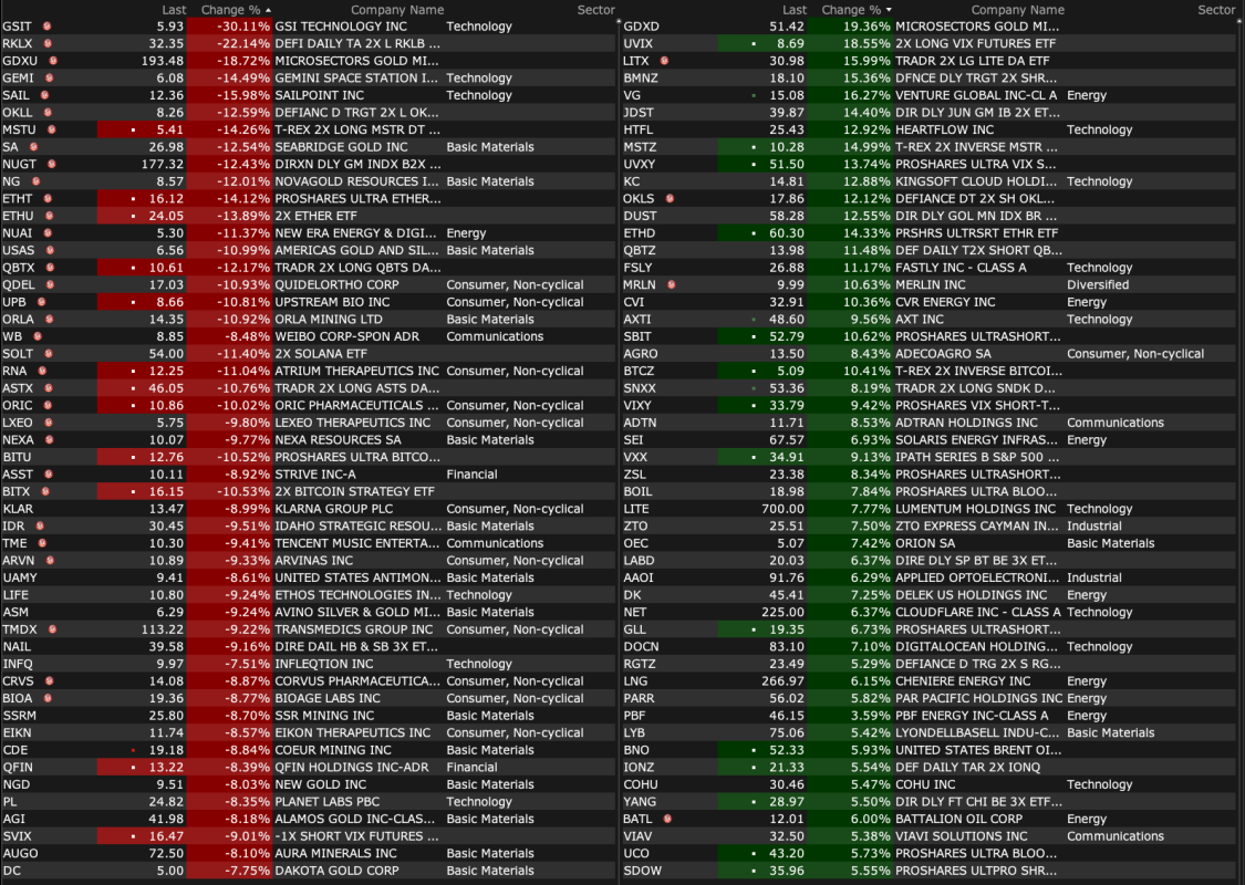 -ARTL +36% (announces Third-Party Fully Funded Clinical Study Agreement to Evaluate ART27.13 in Glaucoma Patients) -SWMR +24% (momentum following IPO) -PERF +23% (receives going-private proposal at $1.95/shr) -OVID +19% (OV329 (7 mg dose) demonstrated favorable safety and tolerability profile, reinforcing best-in-category potential for refractory epilepsies, supporting Indication Expansion; reports earnings and prices 29.9M common share offering at $2.01/unit in Private Placement) -HIT +18% (Health In Tech and Amazon Web Service Advanced Tier Service Partner Ciklum Announce Strategic Collaboration to Accelerate Development of AI-Driven InsurTech Platform) -PDYN +13% (subsidiary selected by U.S Navy to develop low cost near hypersonic missile) -M +7.8% (earnings, guidance) -PTGX +3.9% (receives U.S. FDA approval of ICOTYDE (icotrokinra) for the treatment of moderate to severe plaque psoriasis) -SPIR +2.9% (earnings, guidance) -SLG +2.5% (Deutsche Bank Raised SLG to Buy from Hold, price target: $44) -KNX +2.3% (UBS Raised KNX to Buy from Neutral, price target: $66 from $54) -GRAL +2.1% (TD Cowen Raised GRAL to Buy from Hold, price target: $65 from $114)