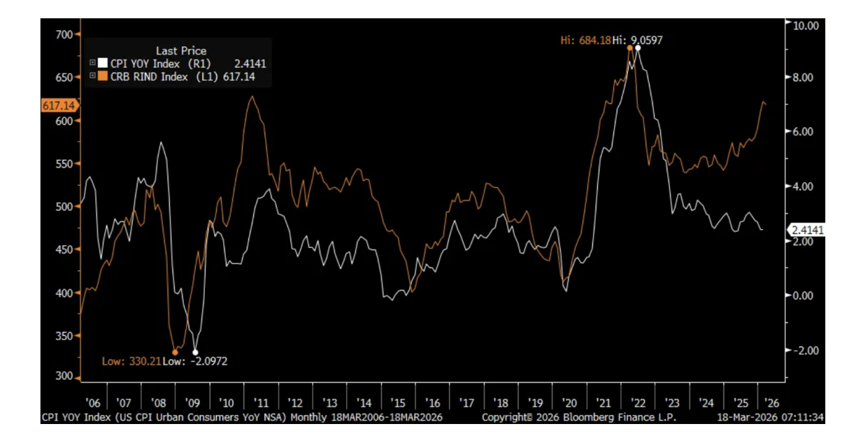 CRB Raw Industrials index in orange/US CPI in white
