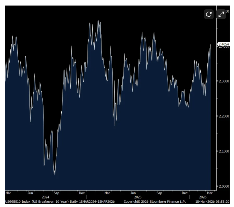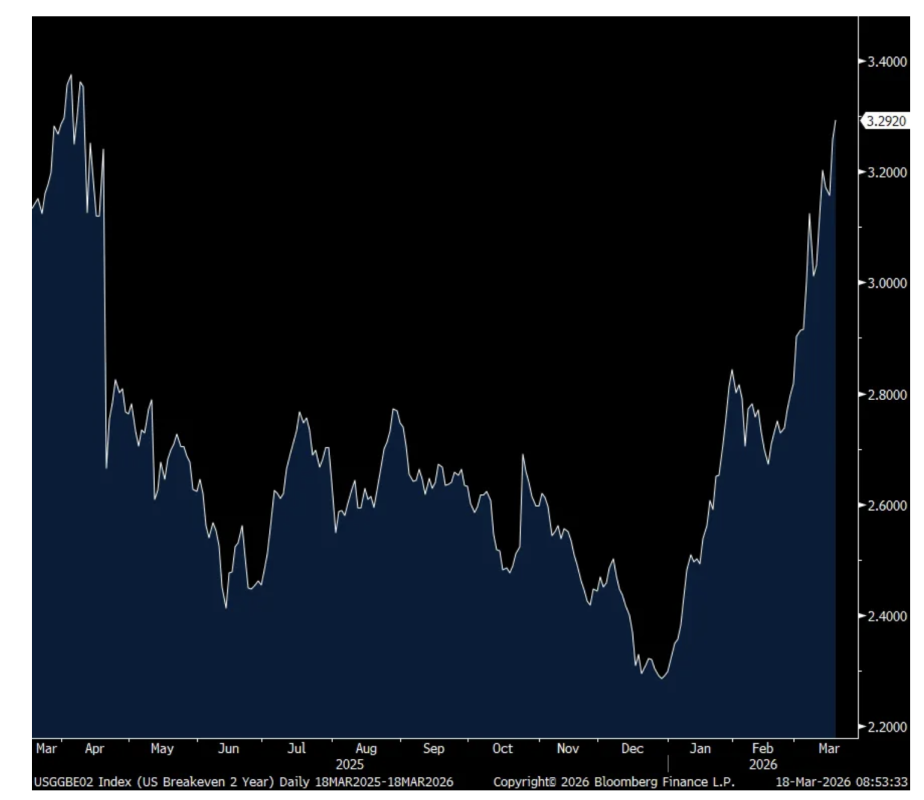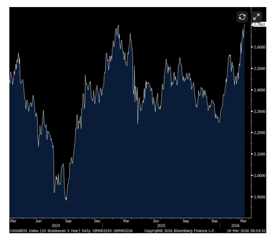 Inflation breakevens are rising in response, particularly the 2 yr which is up by another 3.5 bps to 3.29%, approaching the tariff Liberation Day highs last April. The 5 yr breakeven is now right at the April highs at 2.70%, up 2 bps today. The 10 yr is at a more modest 2.41%, but up from 2.26% right before the war started.