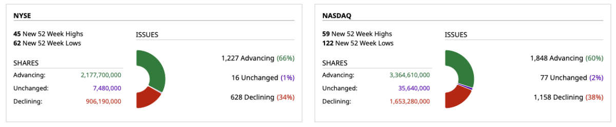 - Nasdaq volume 9% below its one-month average;