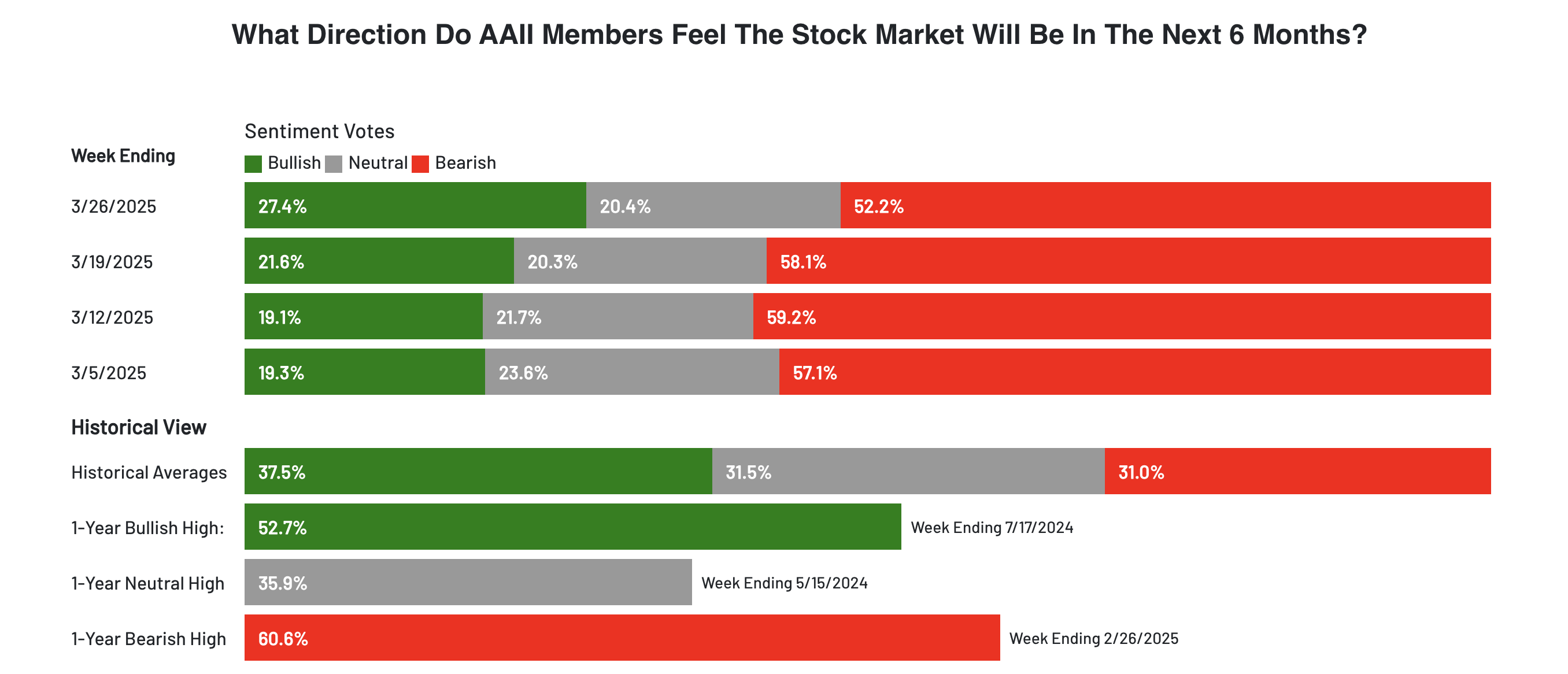 According to the AAII, “Bearish sentiment, expectations that stock prices will fall over the next six months, decreased 6.0 percentage points to 52.2%. Bearish sentiment is unusually high and is above its historical average of 31.0% for the 17th time in 19 weeks.”