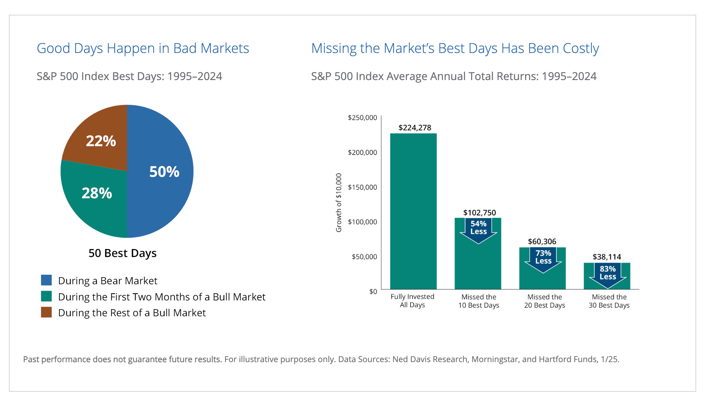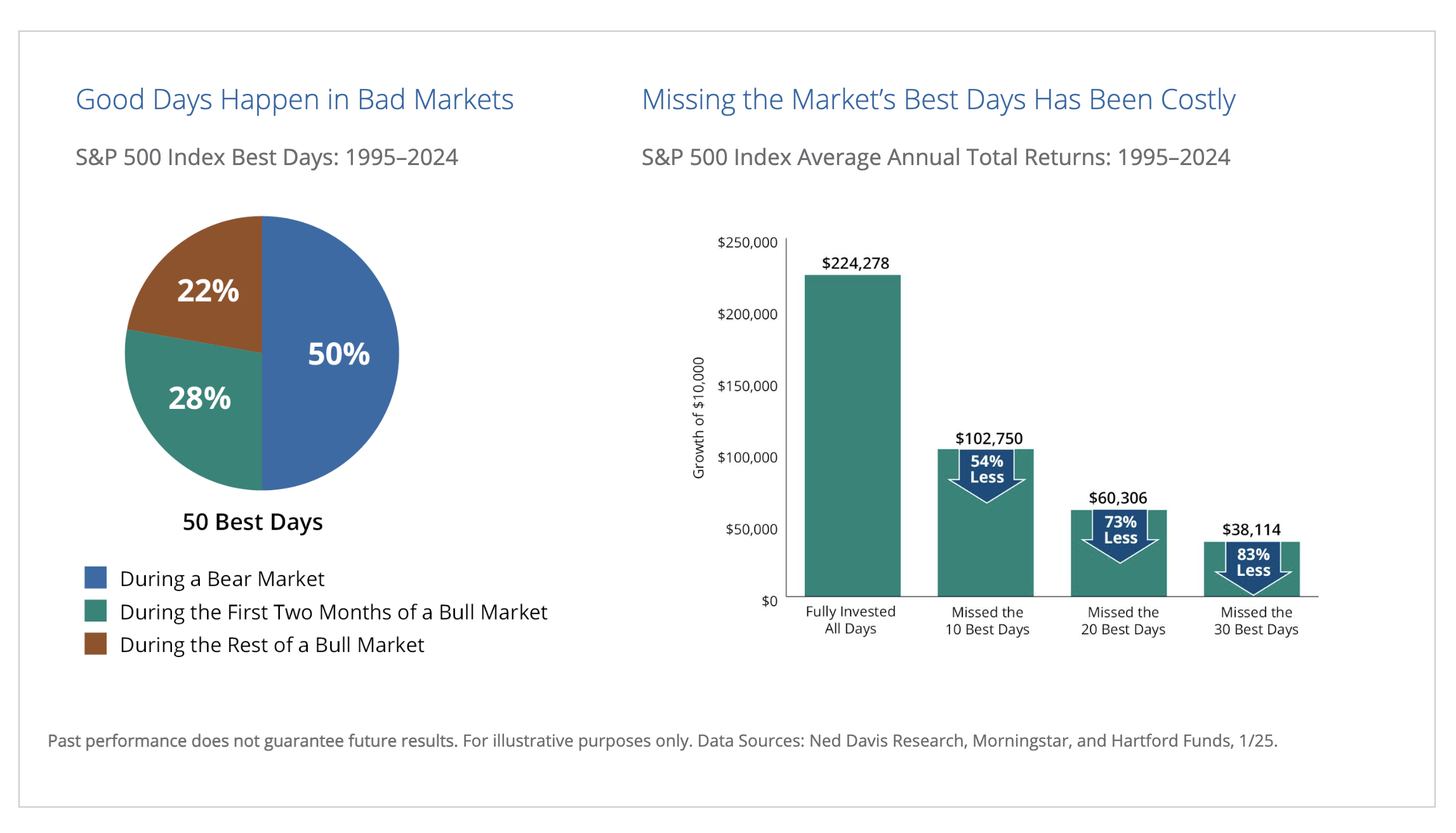 According to Hartford Funds, "Avoiding the market’s downs may mean missing out on the ups as well. Seventy-eight percent of the stock market’s best days have occurred during a bear market or during the first two months of a bull market. If you missed the market’s 10 best days over the past 30 years, your returns would have been cut in half. And missing the best 30 days would have reduced your returns by an astonishing 83%."