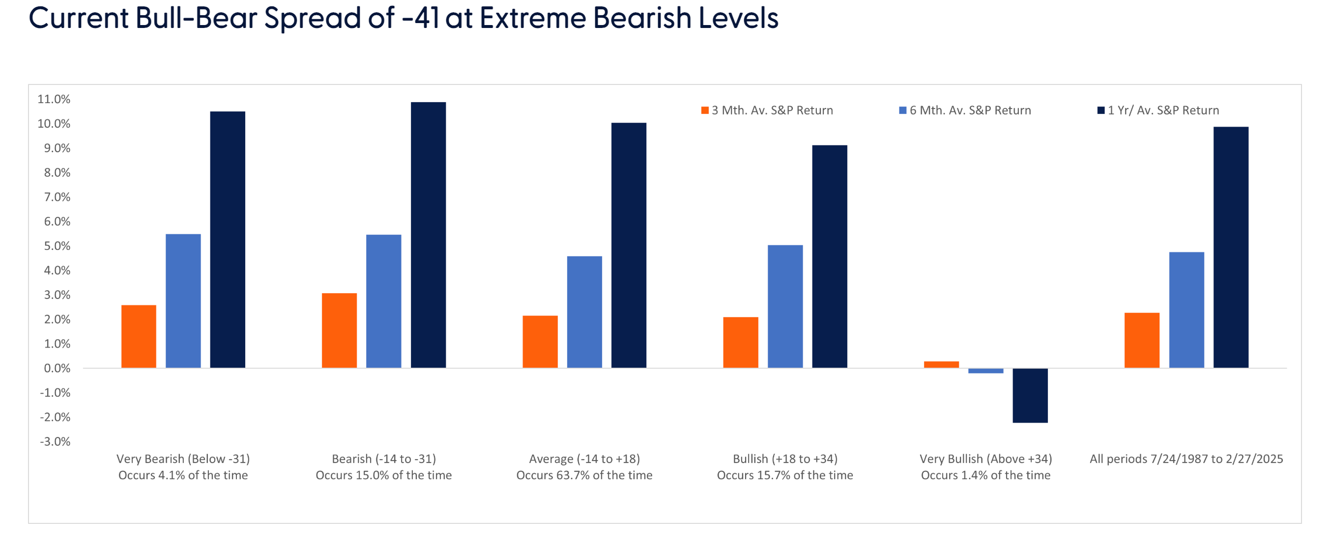 - "Historically, when the bull-bear spread has been at comparable levels of more than two standard deviations below the average (which has occurred only 4.1% of the time going back to July 1987), S&P 500 returns have been above average.”