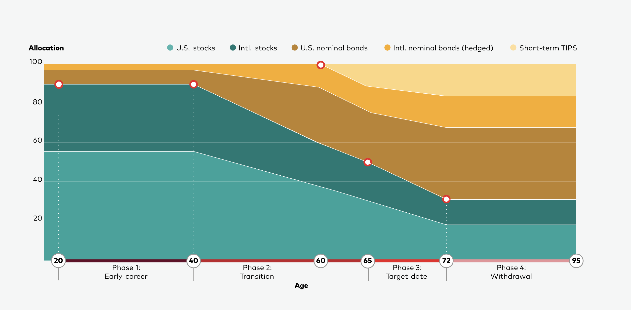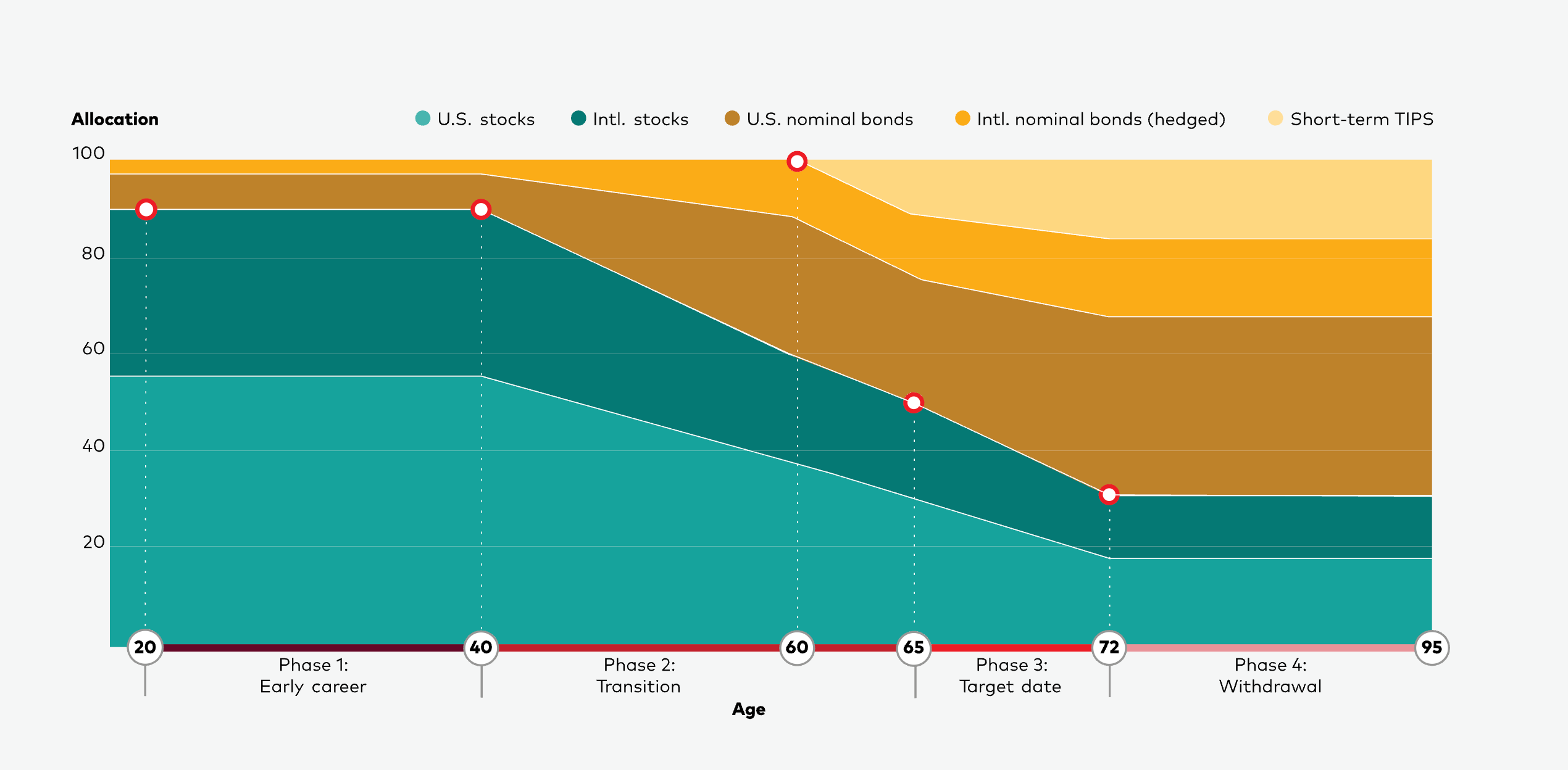 At retirement, which for these purposes is assumed to be age 65, the allocation to stocks decreases to approximately 47.5%. Growth assets here also include real estate investment trusts (REITs) and commodities.