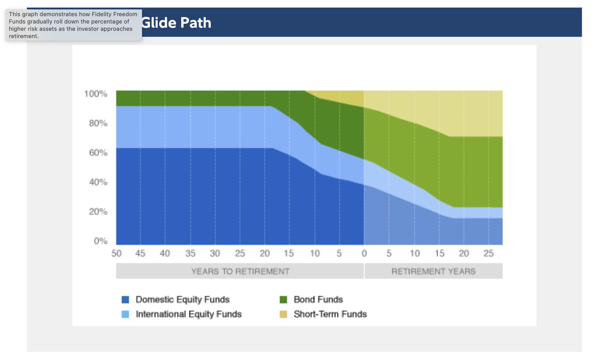 Here's the American Funds glide path as investors approach retirement. The green is fixed income and the blue is stocks.