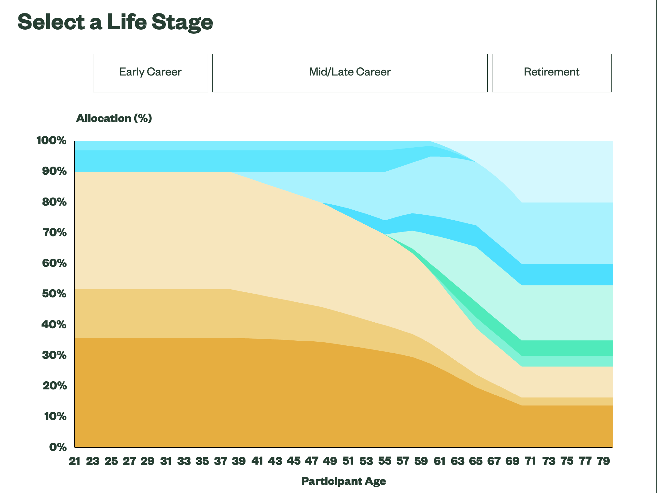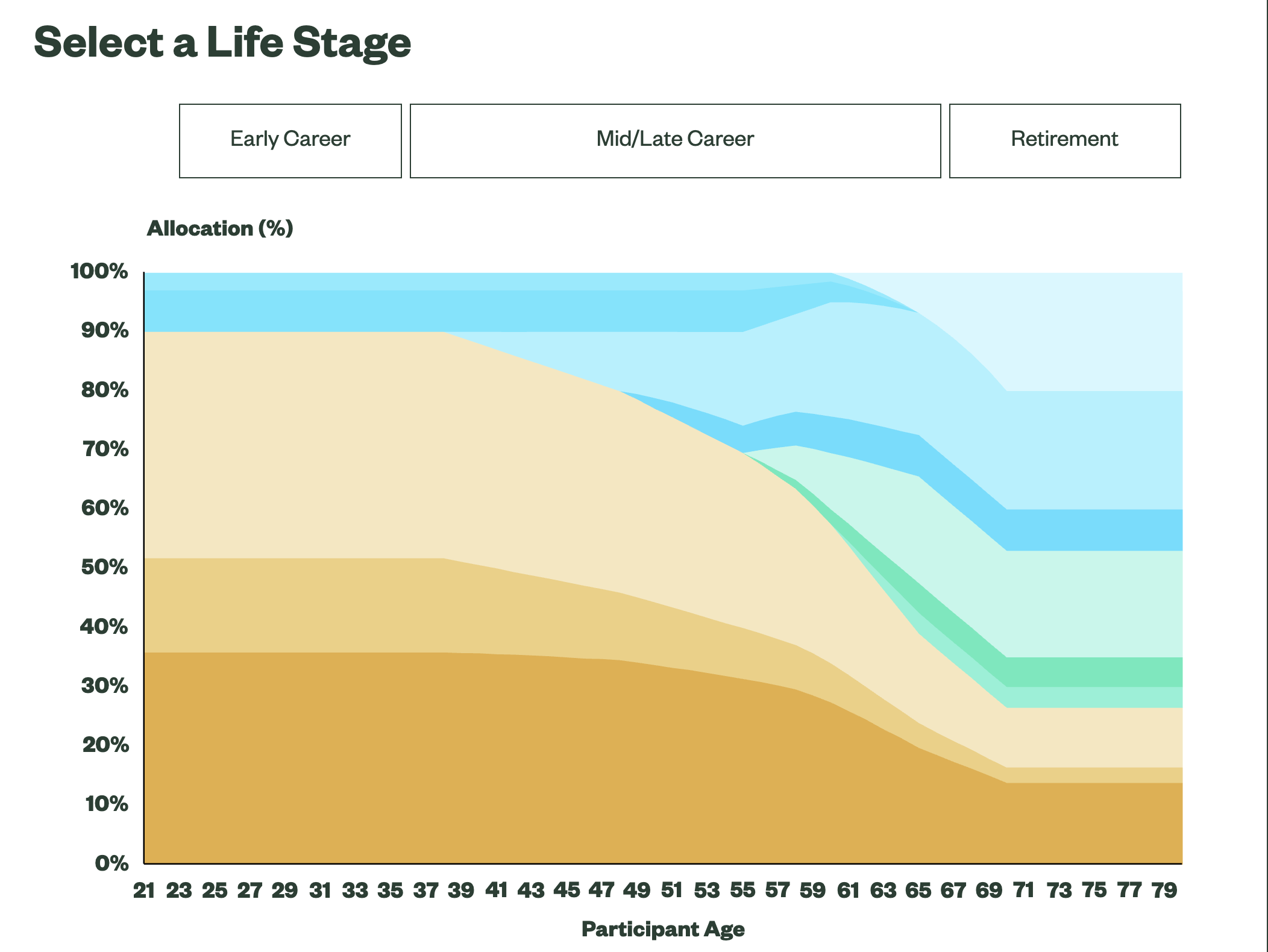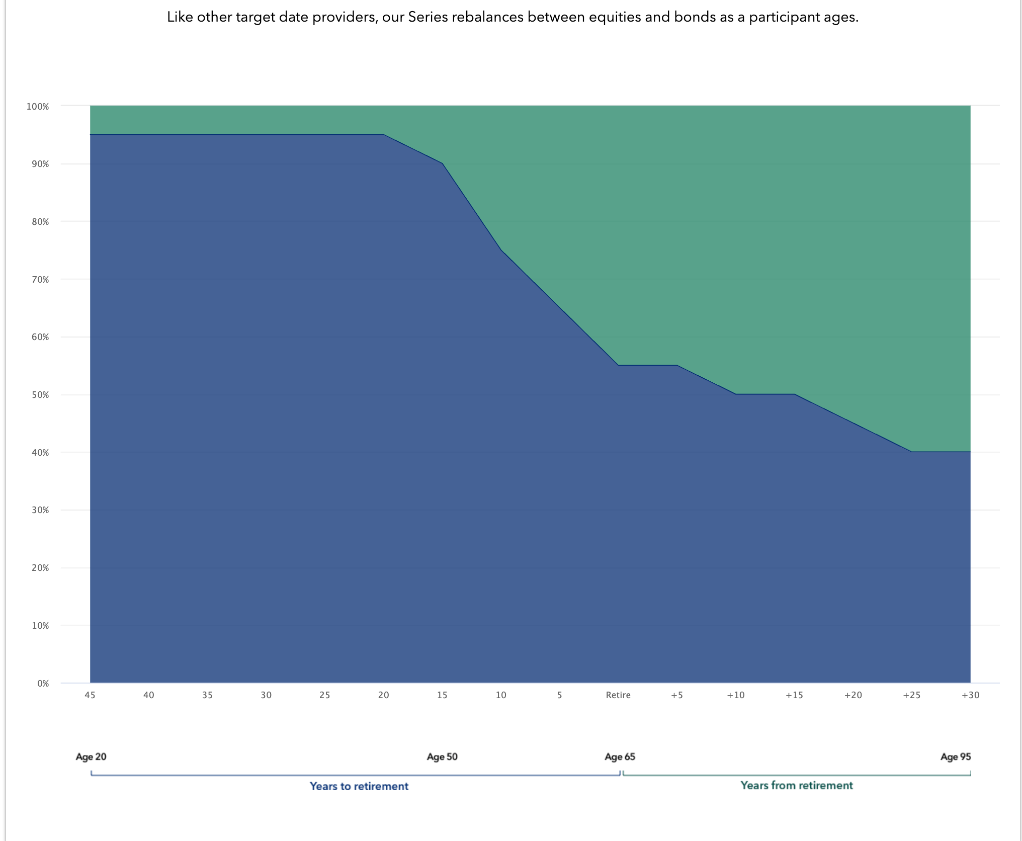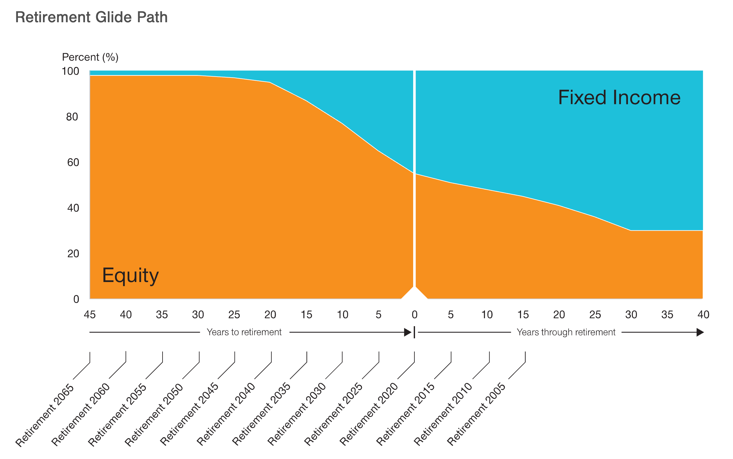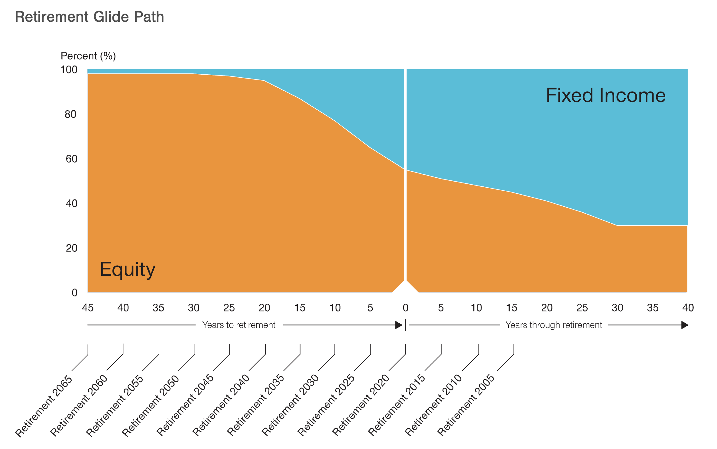 At the target retirement date, the equity sleeve is about 55%, and it continues to decrease after retirement, reflecting a "through" glide path strategy.