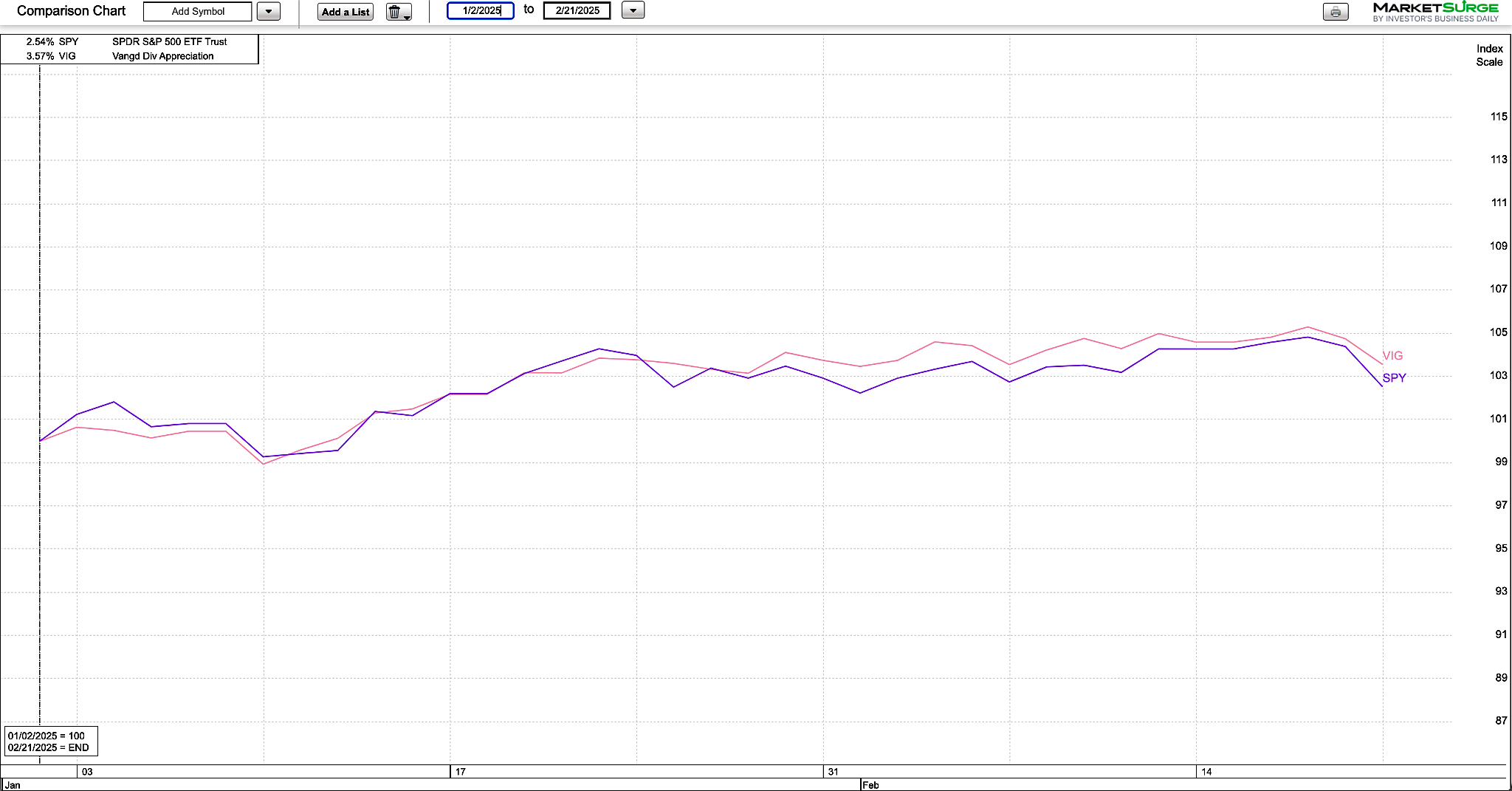 The chart below compares year-to-date performance of the Vanguard Dividend Appreciation ETF VIG versus the SPDR S&P 500 ETF Trust SPY. You can see that the dividend ETF is slightly edging out the growth-heavy S&P 500.