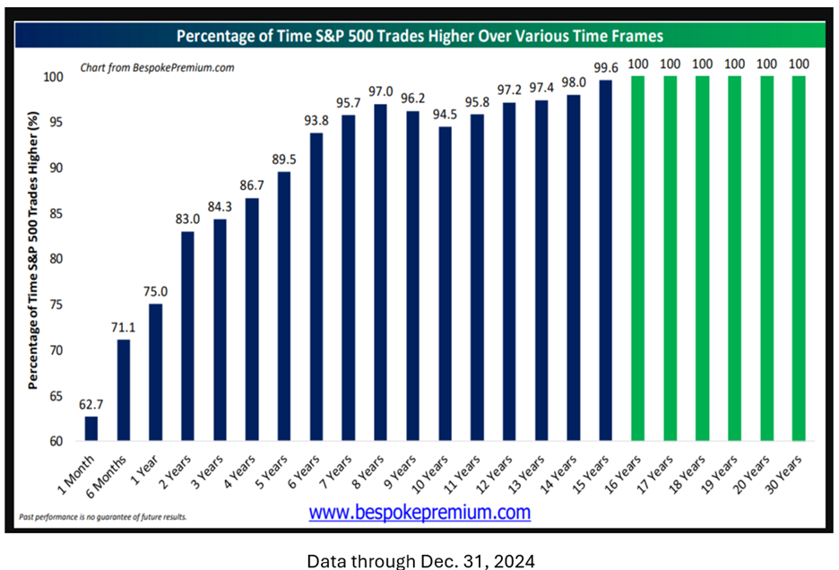 It shows that 75% of all single years since 1928 were profitable. That percentage grew to 83% over all rolling two-year periods and topped 90% for all holding periods of six-years or greater.