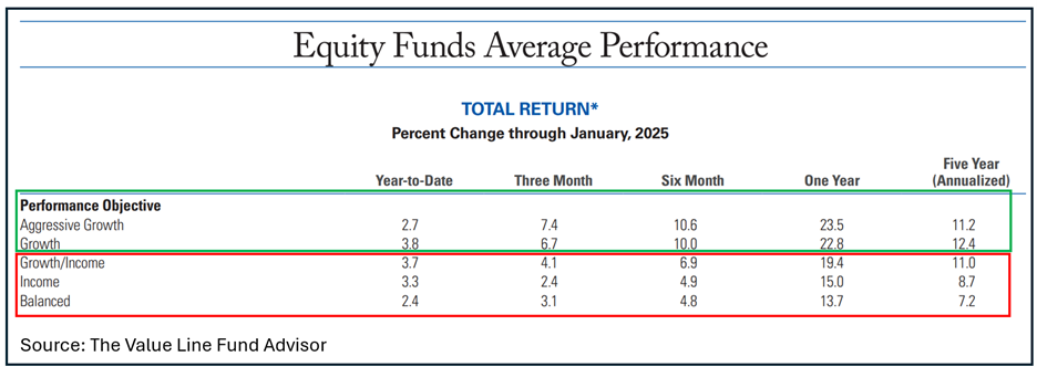 Would you care for just more recent results before allocating your long-term portfolio? Value Line’s equity fund report for various holding periods through Jan. 31, 2025 are listed below.
