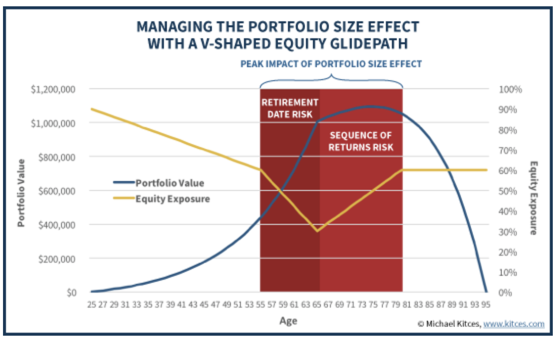 [T]he optimal equity exposure to manage the risks associated with the portfolio size effect over an individual’s full lifecycle would take on a V-shaped glidepath, getting more conservative in the decade leading up to retirement, remaining conservative in early retirement, and then drifting at least somewhat higher again in the later years. -Michael Kitces