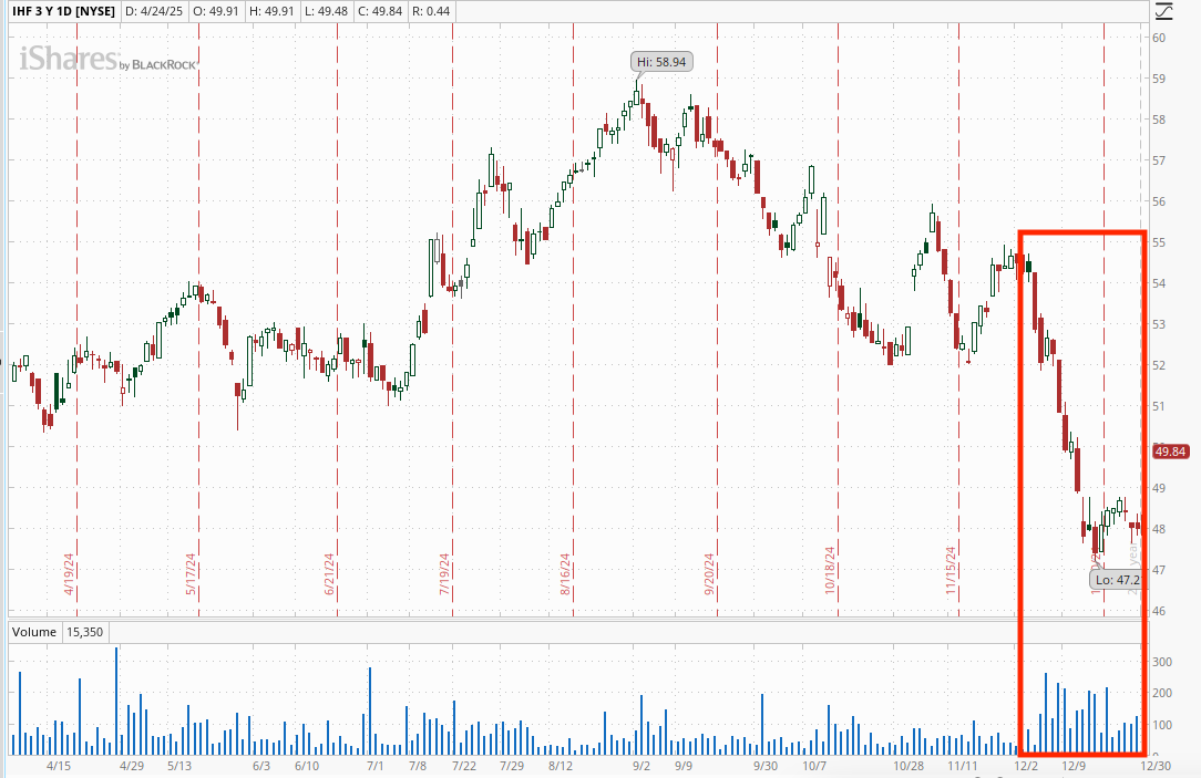 On this chart, you can see IHF trading volume spike throughout December while the price cratered. That means investors were unloading shares, causing the price to drop.