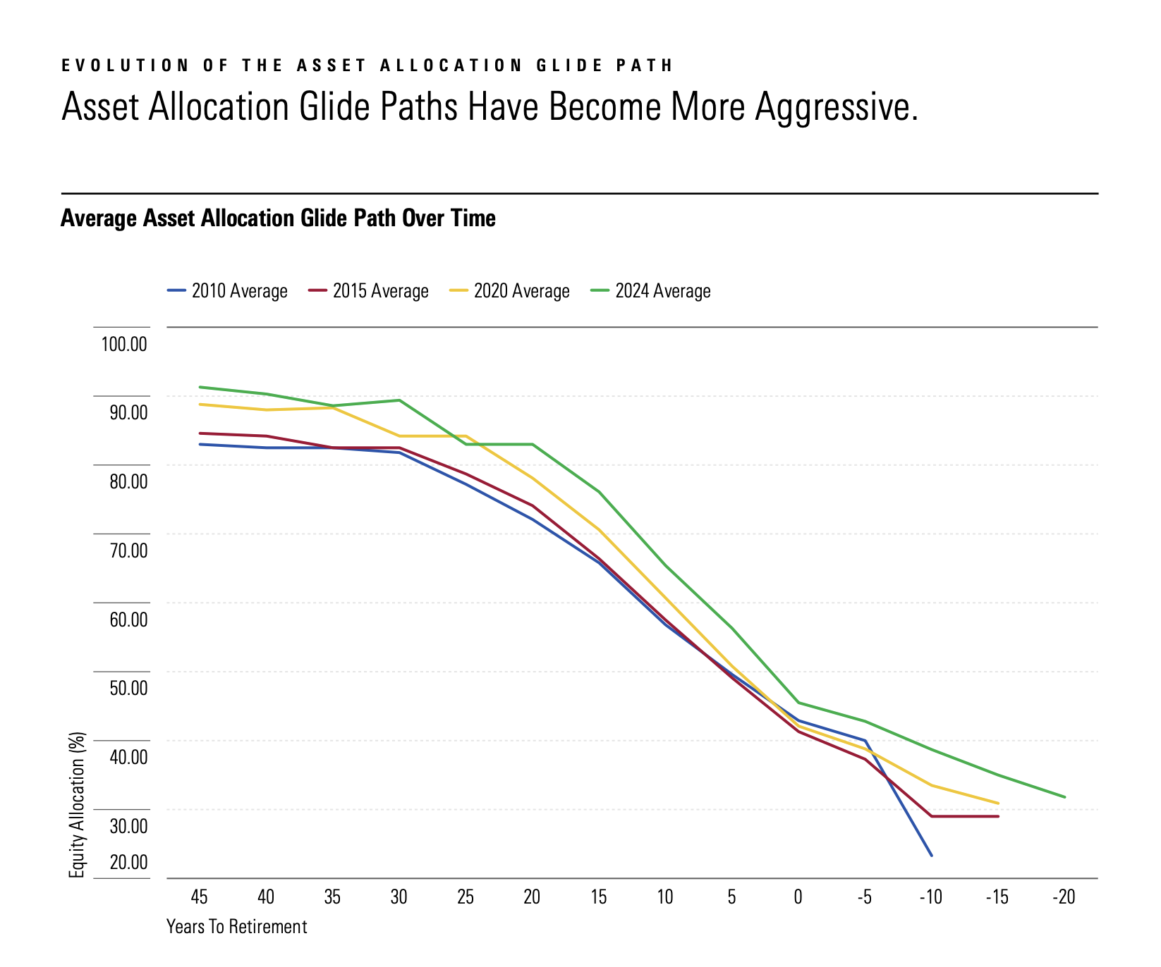 There’s a pretty simple explanation for this: Glidepaths have become more aggressive over the years, as you can see in the graph below.