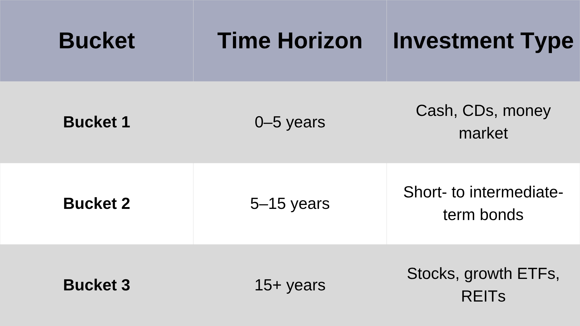You can segment or "bucket" money based on the timeframe of income needs. Here’s how that might look.