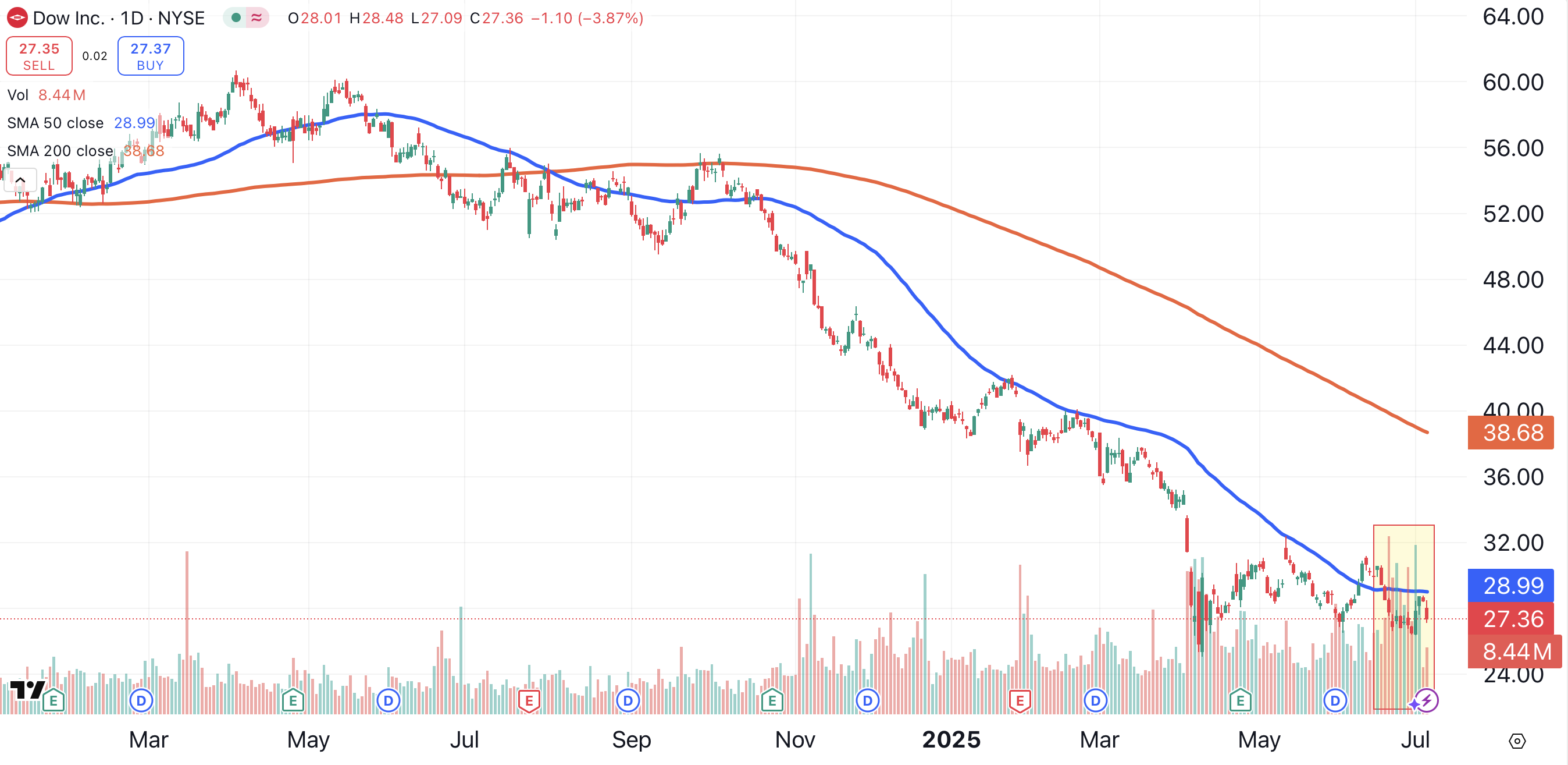 Dow Inc. DOW lost 3.4% in Monday’s trading. The stock has fallen 31% year to date, and 48% over the past twelve months. Last week, Dow traded at a five-year low.