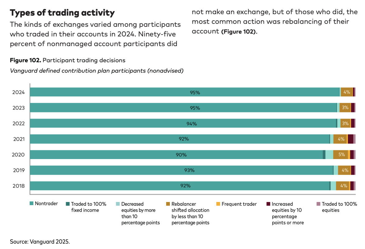 According to Vanguard's How America Saves 2025, which tracks the retirement saving behavior of nearly 5 million plan participants, “During 2024, 5% of nonadvised participants traded within their accounts, while 95% did not initiate any exchanges.”