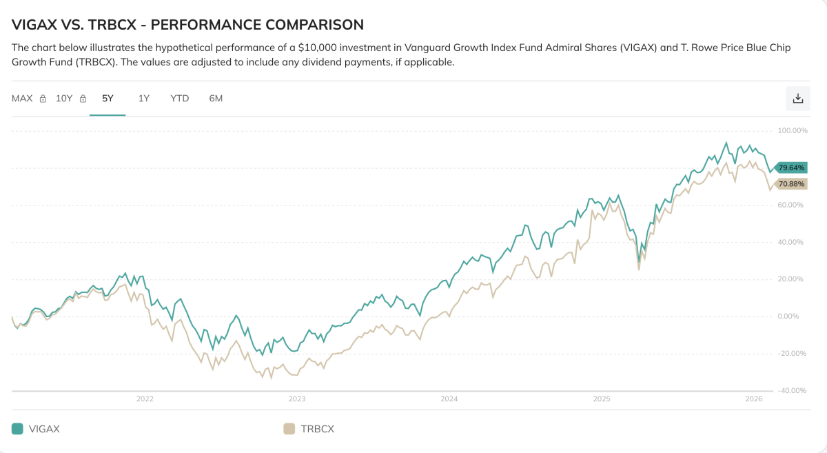 - Vanguard Growth Index Fund (VIGAX): Here, you’ll get exposure to the usual gang of large-cap names: Microsoft (MSFT), Nvidia (NVDA), Apple (AAPL), Amazon (AMZN), Meta (META), at just 0.05%. It tracks the CRSP U.S. Large Cap Growth Index. The actively managed TRBCX's retail shares run at 0.69%, and as noted above, even the institutional class comes in at 0.57%. The image above shows the outperformance of VIGAX over the past five years.
