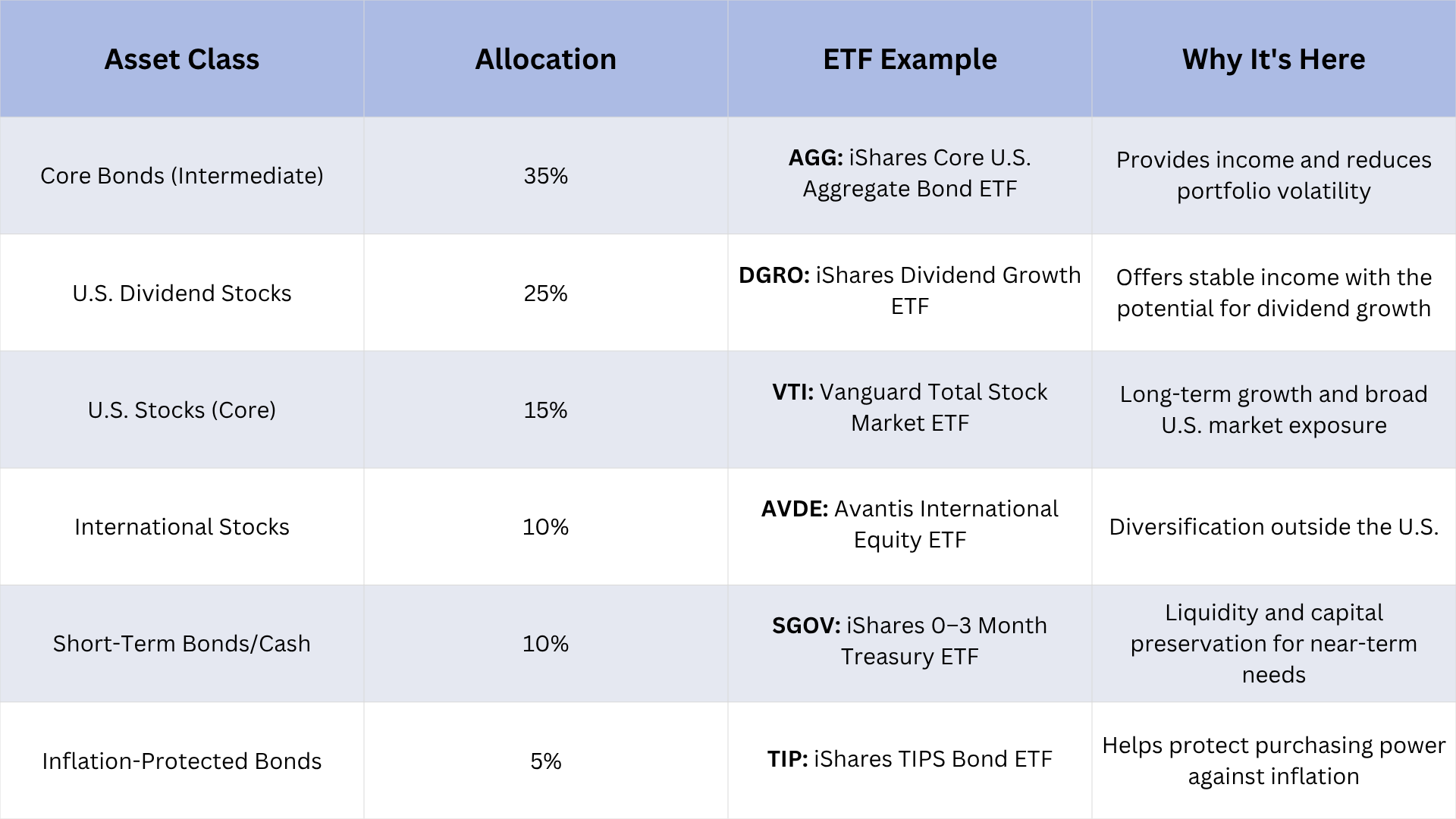 Here’s a sample (and it’s exactly that, not a recommendation) for funds that could constitute a retirement portfolio that balances growth and income while mitigating risk. The account holder in this scenario is a recently retired 67-year-old.