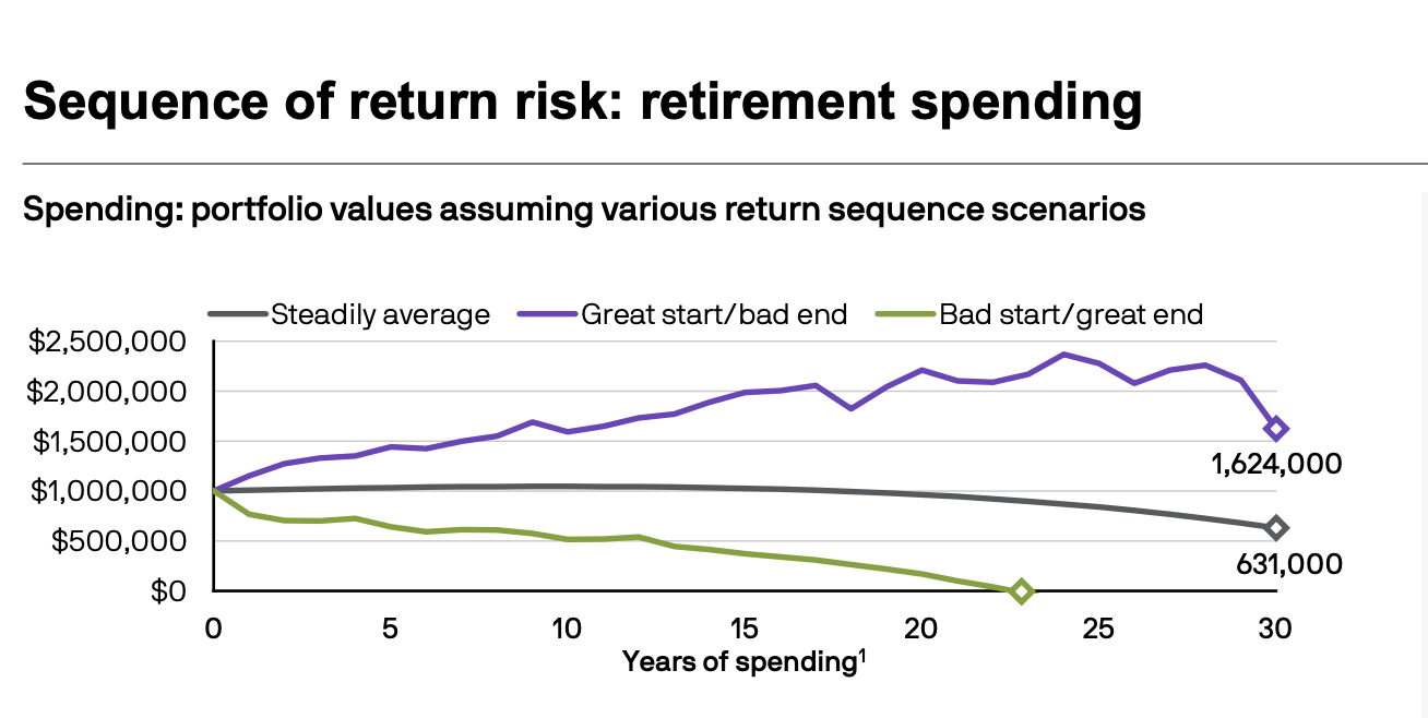 This chart from JP Morgan does a great job illustrating how the order of investment returns (not just the average) affects long-term retirement outcomes when you’re making withdrawals.