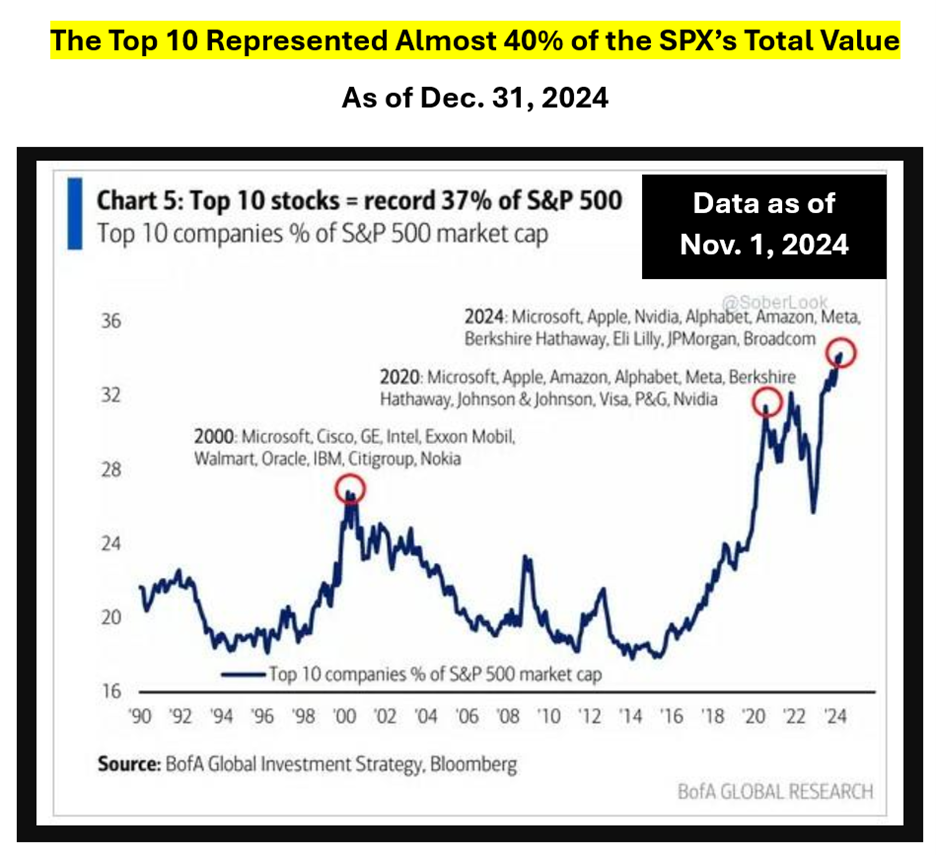 2024 concluded with the highest concentration ever seen in terms of the largest 10 holdings in the S&P 500 Index (SPX) and their make-up of the index’s market value.