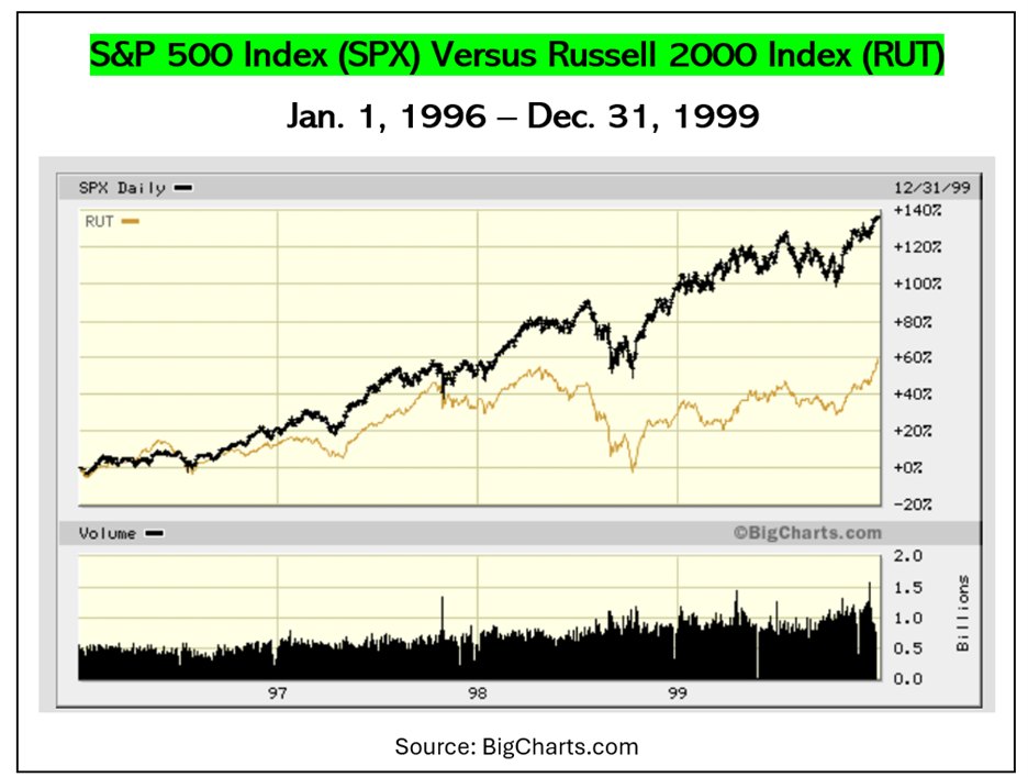 The four-year chart of the SPX versus the Russell 2000 from 1996 through 1999 was the most recent period like today’s situation. The more the mega-cap stocks outperformed, the more “hot money” chased it by sending cash into index funds and ETFs.