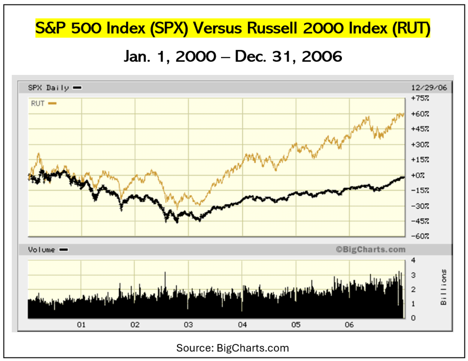 In the following seven years, from Jan. 1, 2000 through Dec. 31, 2006, the Russell 2000 ran up a 60% cumulative outperformance as the S&P 500 went nowhere.