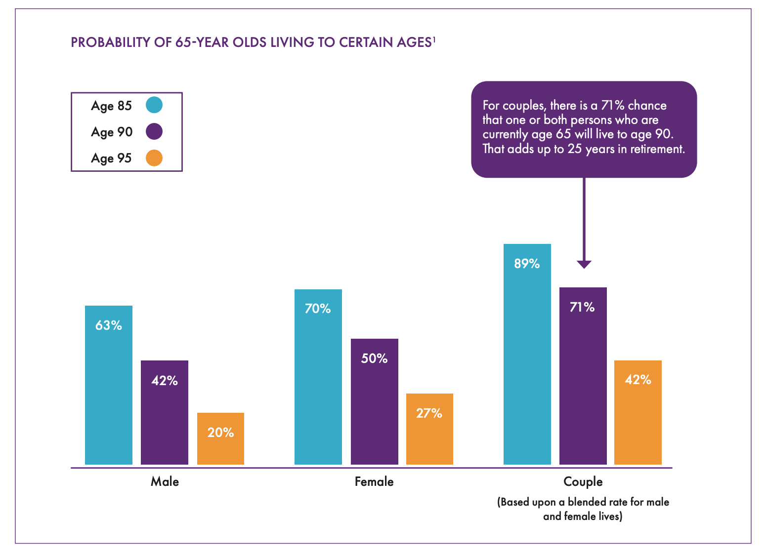 This image from Lenox Advisors shows the probability of a 65-year-old living to 85, 90, or 95. The odds of living to 85 are pretty good!