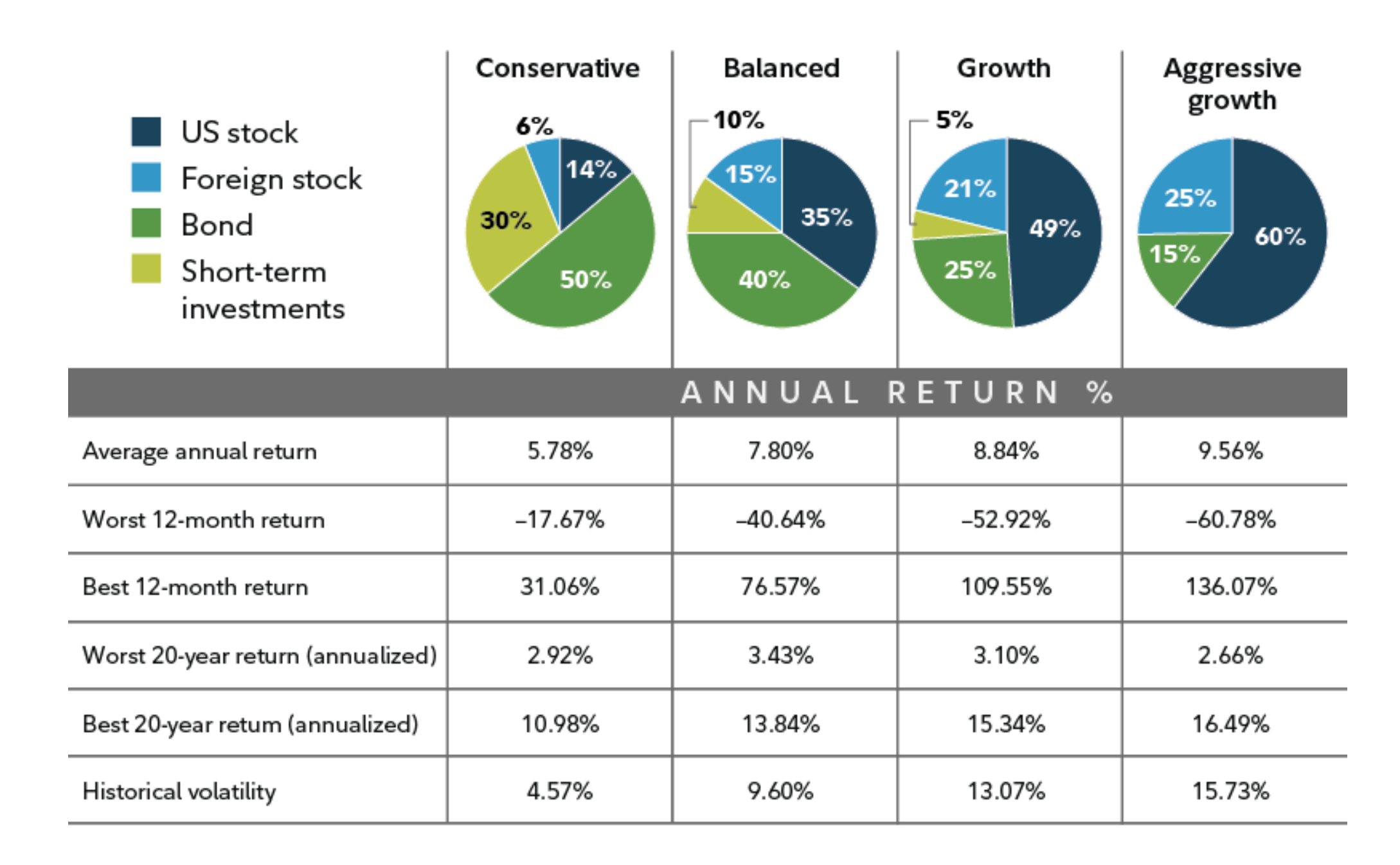 This bar chart gives you a terrific way of comparing different portfolio allocations, showing how a mix of stocks and bonds affects investment performance: