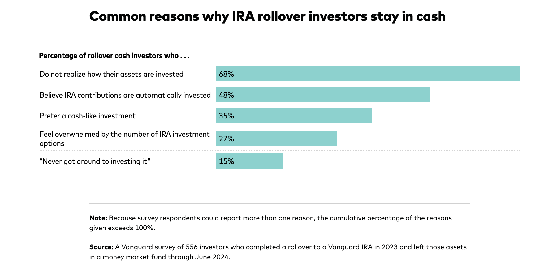 According to a 2024 report from Vanguard, “Out of Sight, Out of Market: The IRA Cash Drag,” a large number of investors who roll employer-sponsored retirement plans to an IRA leave the money untouched, sometimes for years.