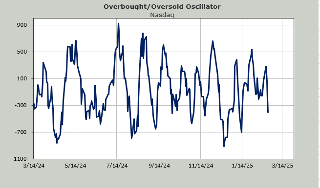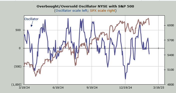 If we look at the Overbought/Oversold Oscillator, many will say it’s oversold. But as long-time readers know, it’s the math behind the indicator that matters. Monday, if the market doesn’t collapse, is likely to see this lift. But after that, the ensuing week doesn’t see us dropping much in the way of red numbers.