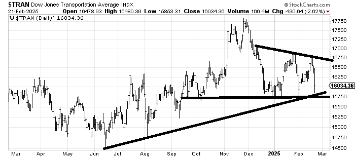 The Transports are at a critical level in that they have not broken it since October. I’m not quite sure that a break is dire since there is support all the way down, but it tells us something if the Transports make a lower low.