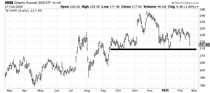Microsoft is still on the list (i.e., it has not broken that 405 area), but now we should add IWM to the list. Many are fussing because it is at the 200-day moving average line, but we have looked at this chart before and noted that 215 level.