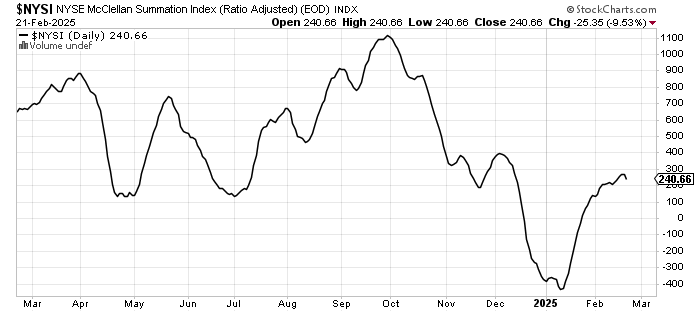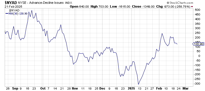 We also saw the McClellan Summation Index roll over. I noted last week that if that particular indicator rolled over, then I thought we’d have a rocky end of February and into early March because the setup was there. The indicator now needs a net differential of +1300 advancers minus decliners to halt the decline. That’s the biggest change from Friday’s giveback.