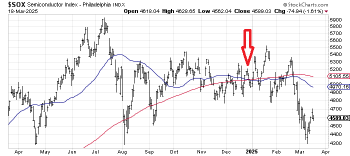 There wasn’t much chatter about the one in the SOX, perhaps because it happened during the holidays, and everyone was still bullish. You can see it didn’t much matter until February when that 200-day moving average rolled over (it was dropping the May rally).