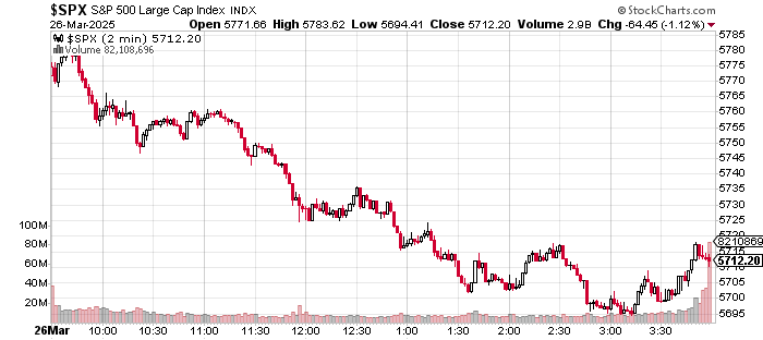 News broke early on Wednesday that Pres. Trump would make a new announcement after the close, which he made after 5 p.m. on the East Coast, and while the intention was probably to avoid disrupting financial markets, markets were pressured literally all day long in anticipation, until there was a smallish short covering going into the closing bell. Take a look at what the S&P 500 looked like on a minute-by-minute chart for the regular session.